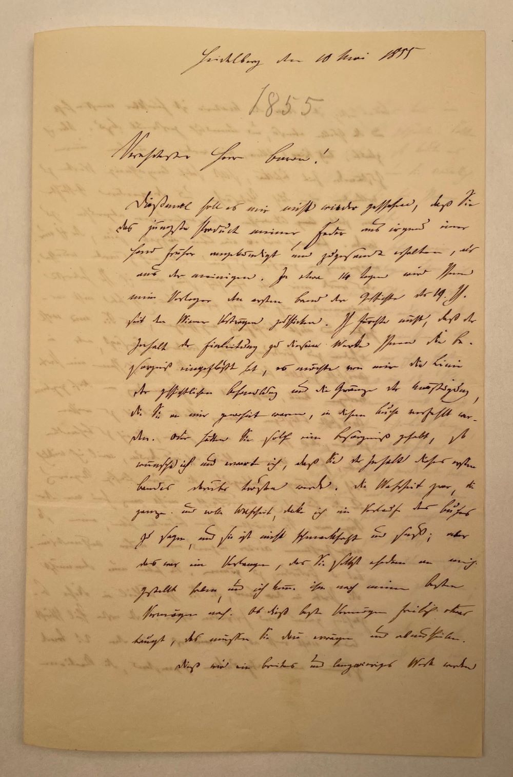 GERVINUS, Georg Gottfried [1805-1871]: Eigenhändiger Brief mit Datum und Unterschrift. Heidelberg, 10. Mai 1855 Groß-Oktav. 22,4 x 14,2 cm. Doppelbogen. 3 1/2 Seiten