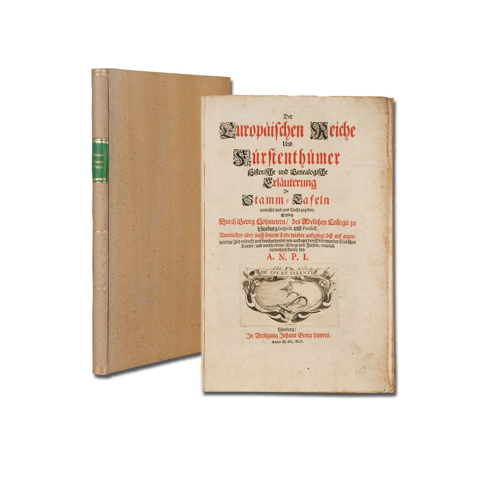 LOHMEIER, G.: Der Europäischen Reiche und Fürstenthümer historische und genealogische Erläuterung in Stamm=Tafeln verfasset/und ans Liecht gegeben. Nunmehro aber nach seinem Tode wieder aufgelegt/biß auf gegenwärtige Zeit erstreckt/und durchgehends/wie auch mit den Stämmen der Teutschen Kayser/und verschiedener Könige und Fürsten/reichlich vermehret/durch A.N.P.I. [d.i. Jacob Wilhelm Imhoff]. Lüneburg J.G.Lippers 1695 Folio. Titel mit gestochener Vignette, 62 und 120 Tafeln, 6 Bl. (davon 2 Bl. Register). Einzelne Blatt mit Randläsuren. Teils etwas gebräunt. Breitrandiges Exemplar. Pappband.