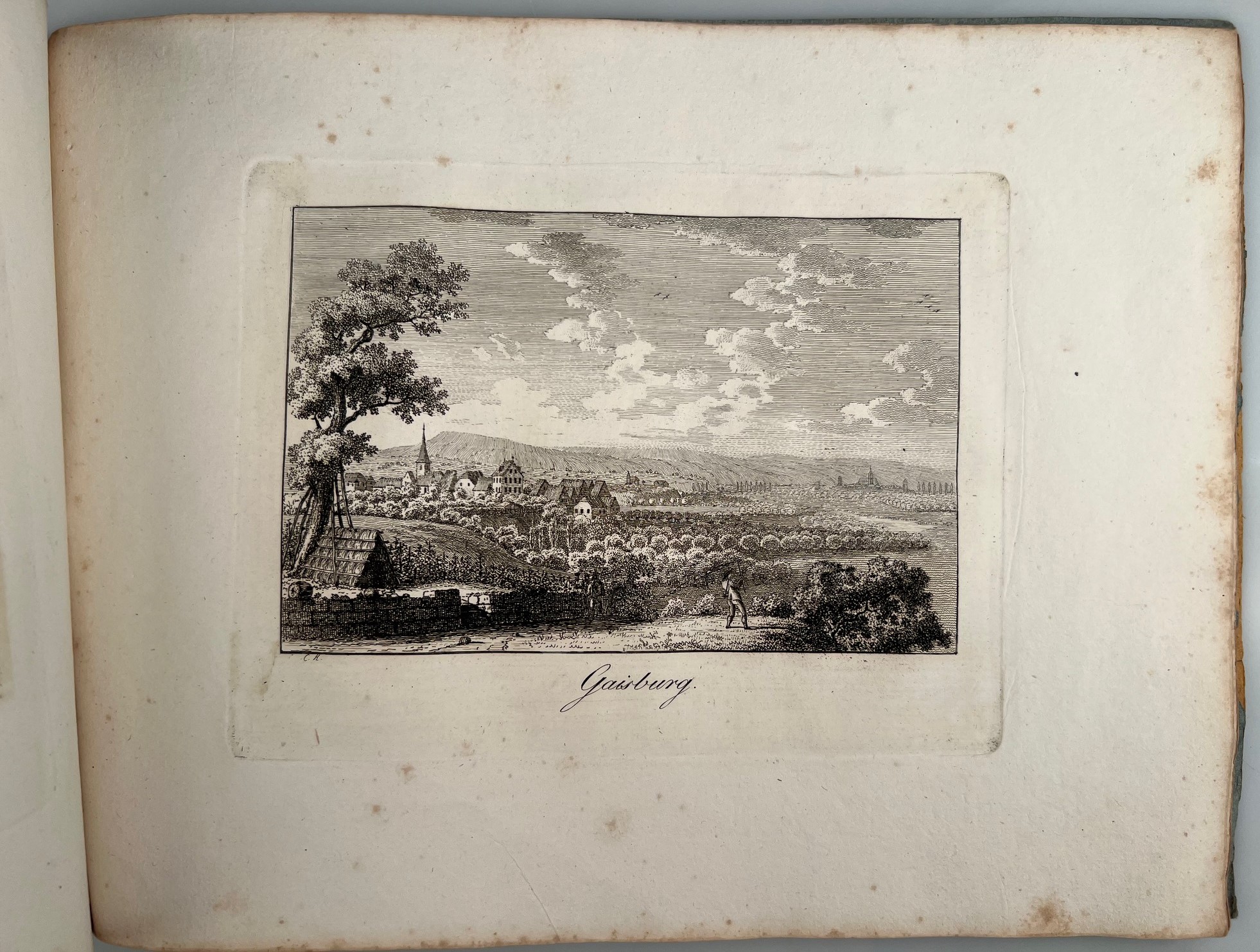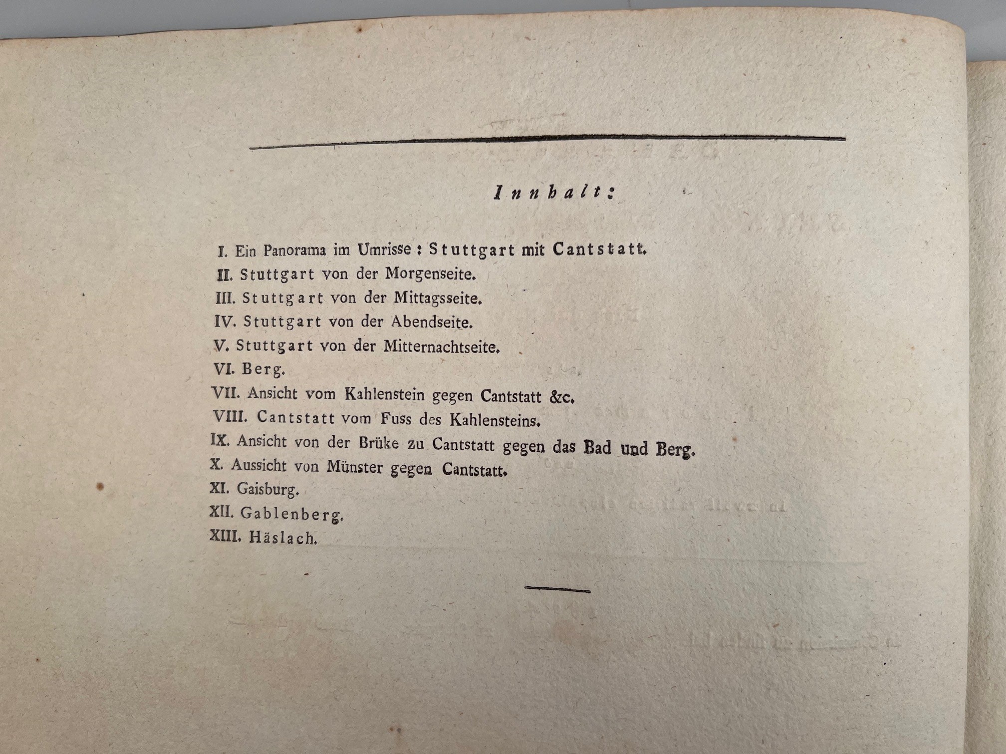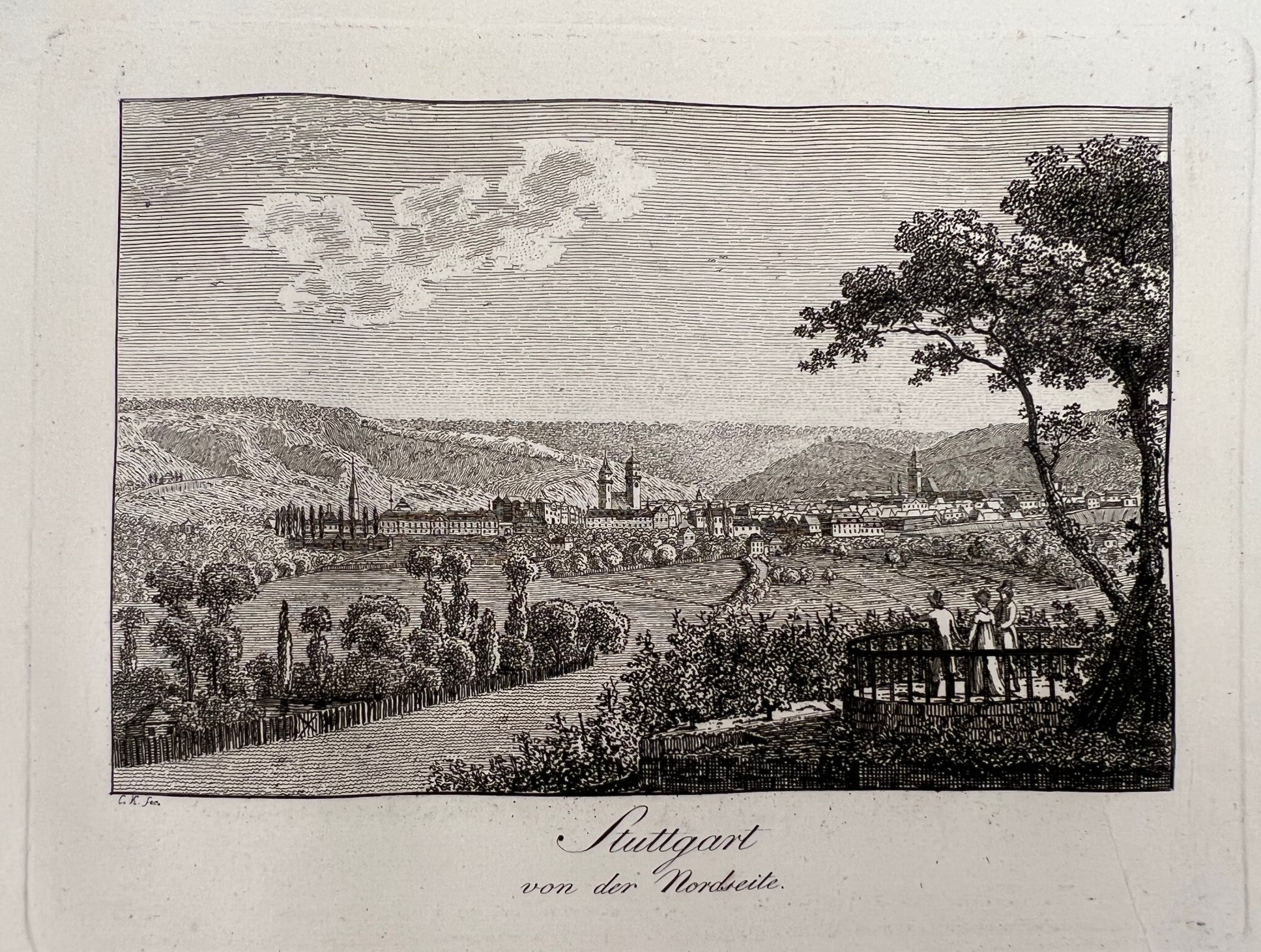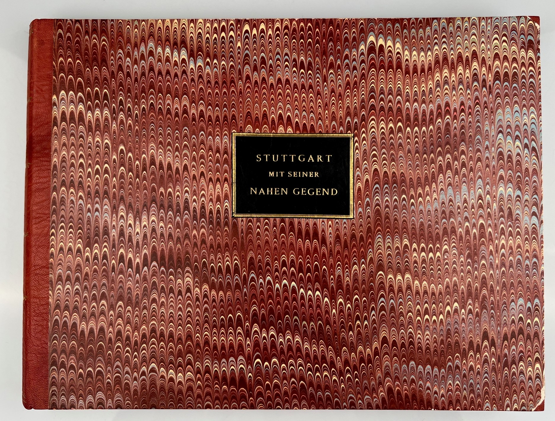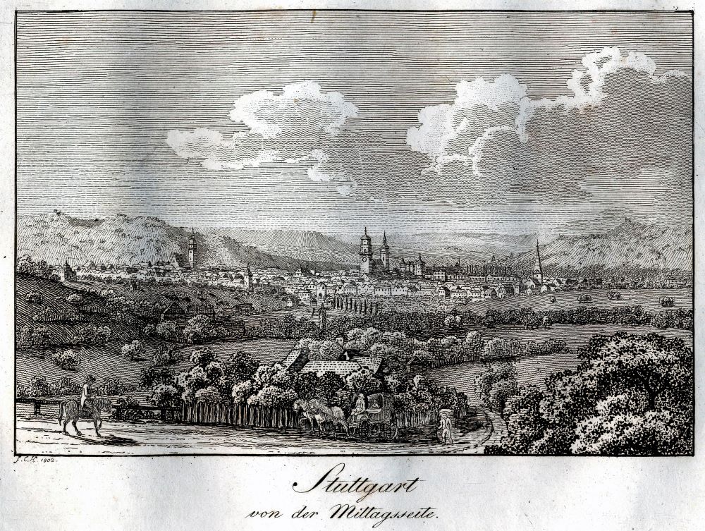 KELLER, C. U.]: Stuttgart mit seiner nahen Gegend. Nach der Natur als Panorama im Umrisse, und in zwölf radirten einzelnen Blättern dargestellt. Stuttgart Loeflund 1804 Quer-Quart. 8 S. 1 Panorama (2 gefalt. Bl.) vom Kahlenstein, 4 Gesamtansichten von Stuttgart, Berg, 3 Ansichten von Canstatt, Münster, Gaisburg, Gablenberg, Heslach. Kaum fleckig, breitrandig. 21/12 Karton der Zeit in späterer Halbleder-Kassette mit goldgeprägtem Deckelschild.