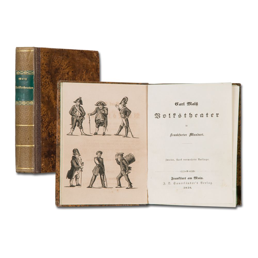 MALSS, Carl: Volkstheater in Frankfurter Mundart. Zweite, stark vermehrte Auflage. Frankfurt J. D. Sauerländer 1850. Kleinoktav. XI. 94 S., 1 Bl., 64, 48, 68, 32, 16, 56, 75, 84 S., mit 2 lithographischen Tafeln (davon 1 als Frontispiz). Halbleinenband der Zeit.