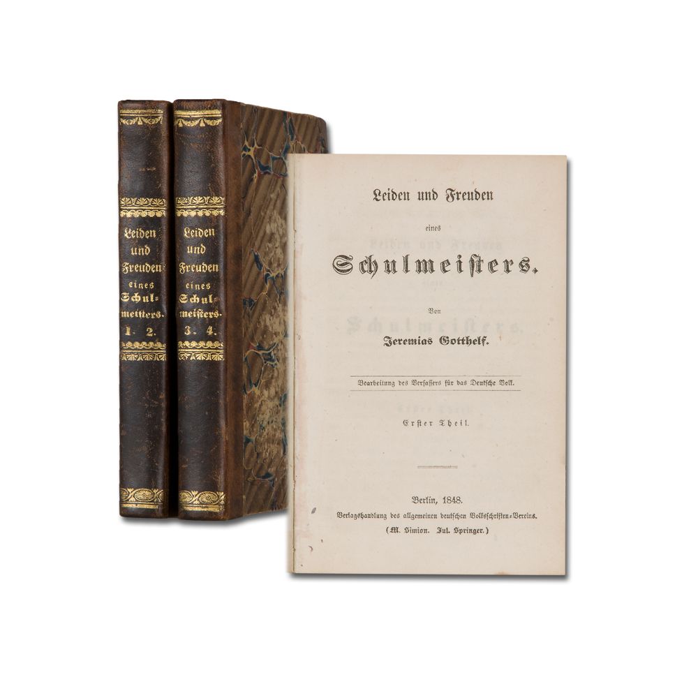 GOTTHELF, J. [Pseud. für A. BITZIUS]: Leiden und Freuden eines Schulmeisters. Bearbeitung des Verfassers für das Deutsche Volk. 4 Teile in 2 Bänden. Berlin, allgemeiner deutscher Volksschriften-Verein (M. Simion; Jul. Springer) 1848. Halblederbände der Zeit mit Rückenvergoldung.
