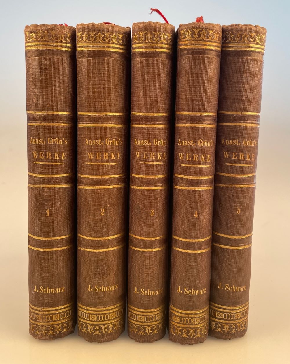 GRÜN, A. [Pseud. für A. A. Graf von AUERSPERG]: Gesammelte Werke. Hrsg. von L. A. Frankl. 5 Bände. Berlin G. Grote 1877 Stahlstich-Portrait und zahlreiche Holzschnitte im Text. Gelegentlich minimal fleckig. Sehr schöne Leinenbände der Zeit mit ornamentaler Rückenvergoldung.
