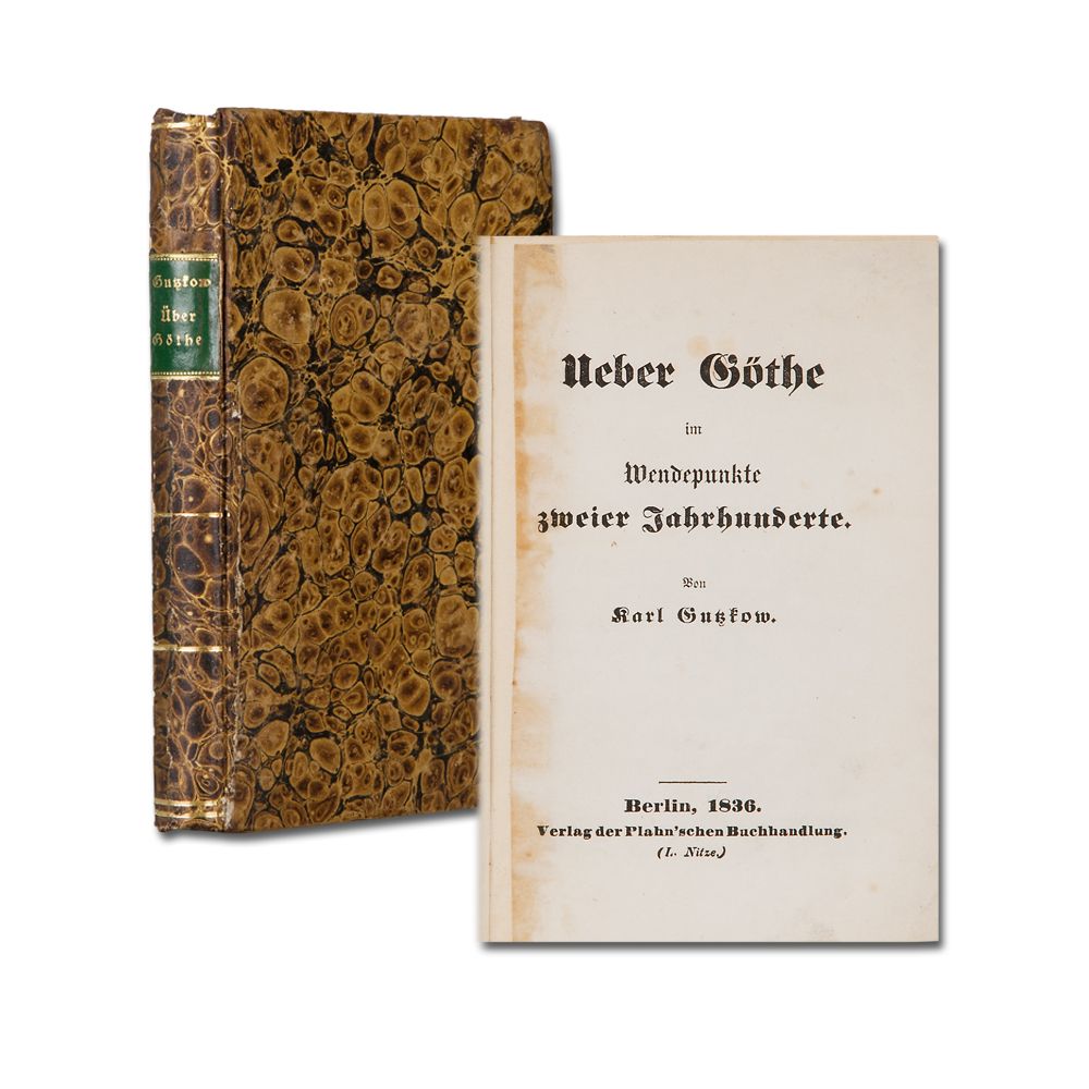 GUTZKOW, K.: Ueber Göthe im Wendepunkt zweier Jahrhunderte. Berlin, Plahn 1836. 1 Bl., XII, 256 S. Titelblatt im Falz hinterlegt. Teils etwas stockfleckig. Ohne das Blatt Verlagsanzeigen. Pappband der Zeit.