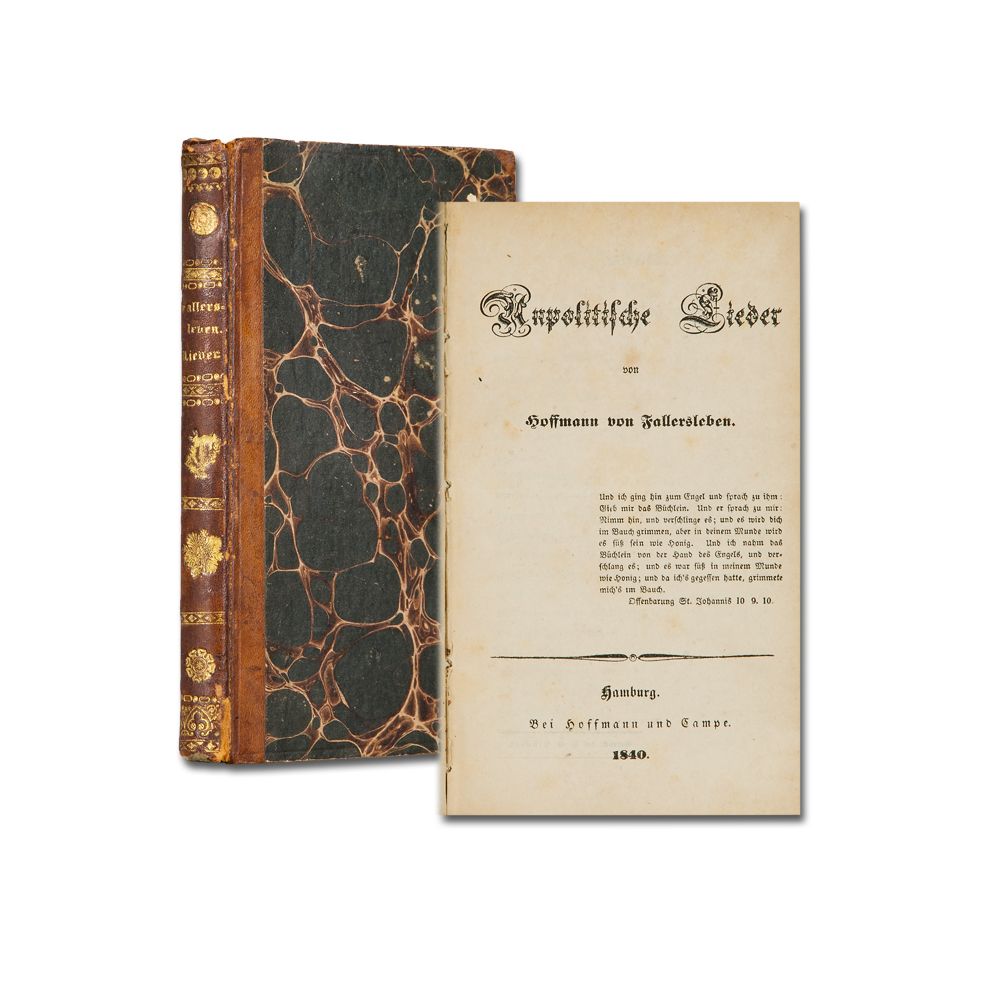 HOFFMANN von FALLERSLEBEN, [A. H.]: Unpolitische Lieder. [Teil 1 von 2]. Hamburg, Hoffmann und Campe 1840 S. III-XII, 205 S. Ohne den Vortitel. Teils stockfleckig. Adeliges Exlibris im Vorsatz. Halblederband der Zeit mit ornamentaler Rückenvergoldung.