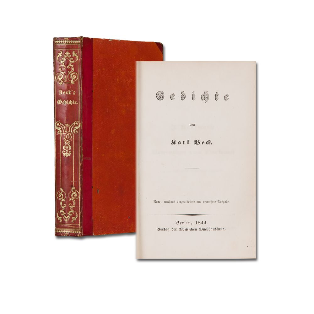 BECK, K.: Gedichte. Neue, durchaus umgearbeitete und vermehrte Ausgabe. Berlin, Voss 1844. 3 Bl., 344 S. Alter Name und Exlibris im Vorsatz. Frisches Exemplar. Halblederband der Zeit mit reicher Rückenvergoldung.