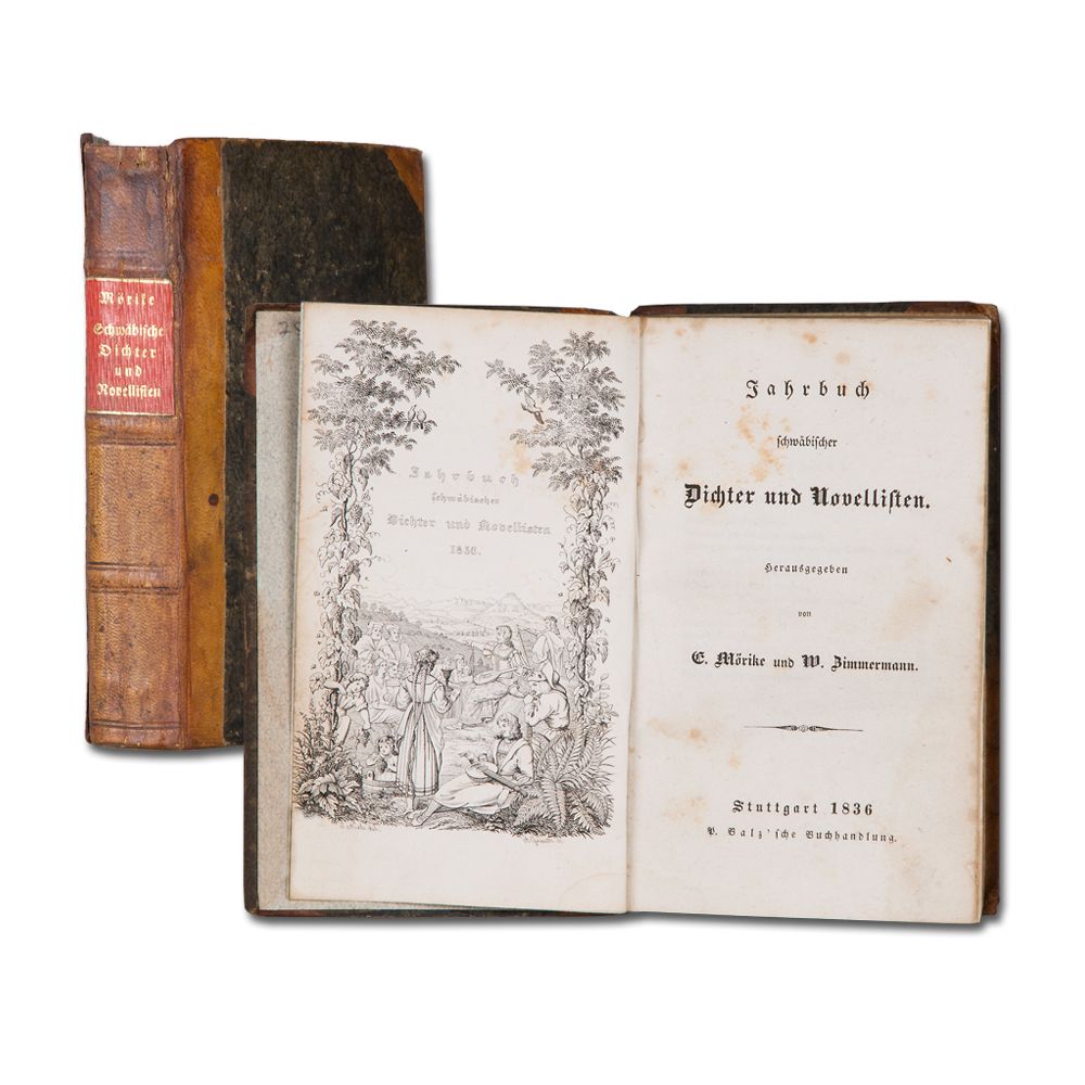 MÖRIKE, E. und W. ZIMMERMANN [Hrsg.]: Jahrbuch schwäbischer Dichter und Novellisten. Stuttgart P.Balz 1836 Titelkupfer von A.Gnauth nach J.Nisle, 5 Bl., 377 S. Stockfleckig. Vorsätze erneuert. Rückengelenk repariert. Halblederband der Zeit