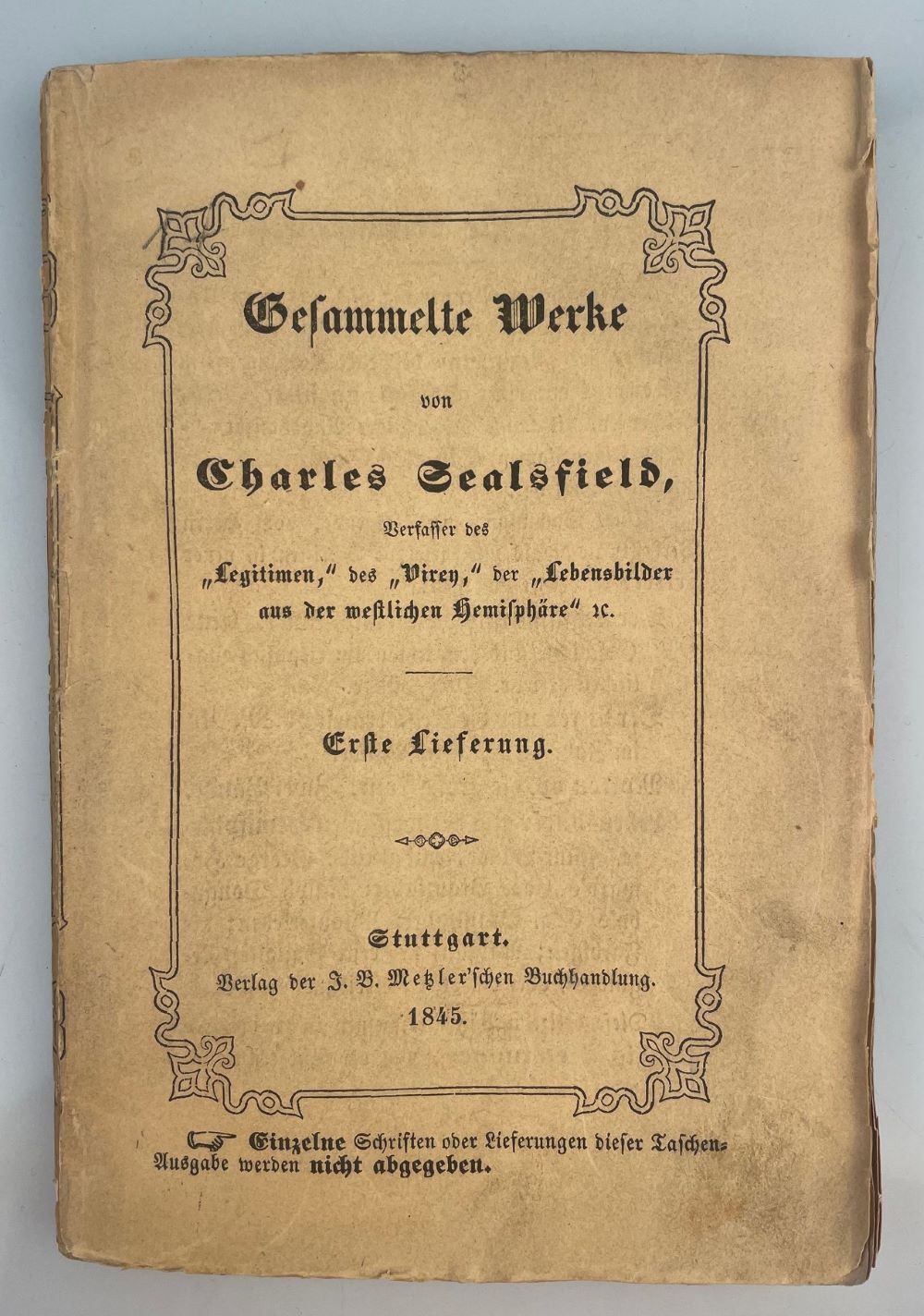 Seltene erste Gesamtausgabe. - Diese Taschenausgabe mit Sammel- und Individualtitel war ursprünglich nur mit 13 Teilen geplant, ohne das "Cajütenbuch", und muss daher als erste Gesamtausgabe angesehen werden. Erstmals wird in dieser dritten durchgesehenen Auflage auch der Verfasser genannt. Sealsfield - bis heute undurchsichtig, ein sehr interessanter und zu Unrecht vergessener Schriftsteller - entfloh 1823 aus dem Kreuzherrenstift in Prag nach Amerika und lebte dort höchst erfolgreich als Spekulant, politischer Agent und Schriftsteller. Er erforschte den Kontinent von Mexiko bis in die Neu-England-Staaten und entwickelte sich zum entschiedenen Gegner des puritanisch-calvinistischen Kapitalismus der Nordstaaten. In seinen Romanen zeigt er eine bemerkenswerte Vertrautheit mit den politischen, ökonomischen und sozialen Zuständen der Union. Unglaublich ist seine umfassende in nur 8 Jahren erworbene Kenntnis von Landschaften, Zuständen und Menschen ungeheurer Gebiete. In seinen Schriften "erarbeitete Sealsfield ein politisch-soziologisches Romanwerk, das . . . von barocken Grundlagen unmittelbar zum amerikanischen Roman der Gegenwart - Hemingway, Steinbeck, Faulkner - reicht. Als höchste dichterische Leistung stellt sich die prosaepische, im deutschen Schrifttum einmalige Bewältigung des neuen amerikanischen Lebensgesamts dar" (E. Alker). In seiner Romantechnik verwendet er das Nebeneinander der Romane Gutzkows lange vor diesem. Sealsfield gilt als Begründer des exotisch-realistischen Romans. "Diese Metzler'schen waren seinerzeit mit die ersten Verlagserzeugnisse, die einen in jeder Hinsicht schönen Druck aufwiesen, der noch jetzt als mustergültig angesehen wird" (A. Kresse). - Kresse 14; Rabenlechner 84. Er erzählt "in einer Weise, daß ihn keiner vergißt, der ihm einmal zugehört hat" (Hugo v. Hofmannsthal).