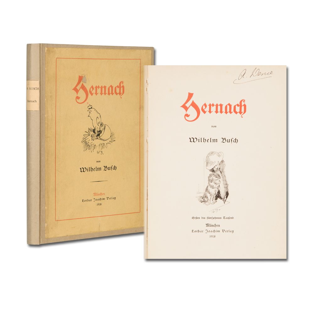 BUSCH, W.: Hernach. 1. - 15. Tausend München L. Joachim 1908 Quart. 2 Bl., 62 numerierte Bl. mit 96 teils farbigen Abbildungen auf Tafeln. Pappband unter Verwendung des Originalumschlags