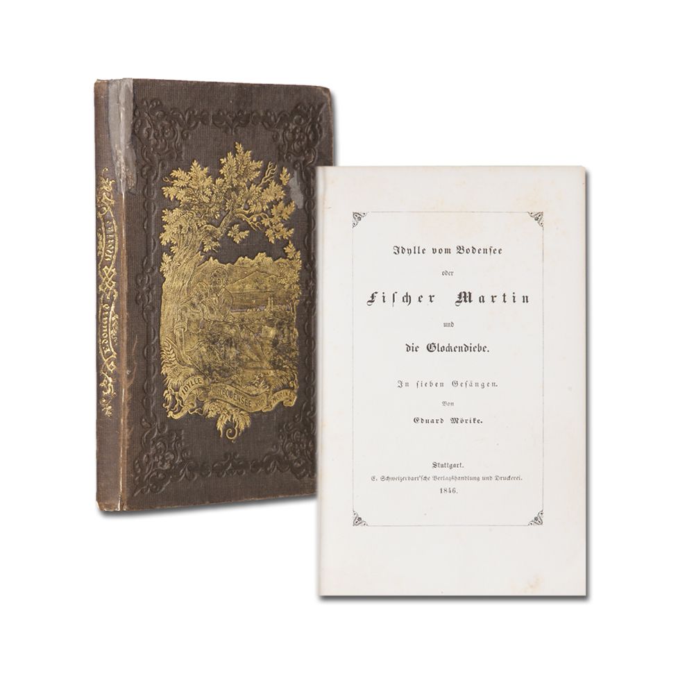 MÖRIKE, E.: Idylle vom Bodensee oder Fischer Martin und die Glockendiebe. In sieben Gesängen. Stuttgart E. Schweizerbart 1846 4 Bl., 138 S., 1 Bl. Alter Name im Vorsatz. Vorsätze aus gelbem Glanzpapier (im Falz restauriert). Goldschnitt. Brauner Originaleinband mit goldgepräger Deckel-Illustration, bez. unten links "G. Schiller" und Blindprägungen. Rücken unauffällig repariert.