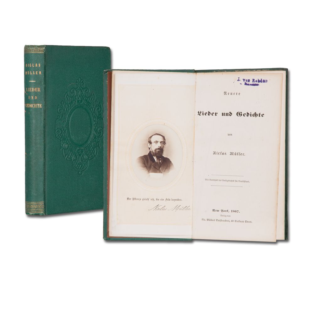 MÜLLER, Niclas: Neuere Lieder und Gedichte. New York N. Müller 1867 VIII, 2 Bl., m276 S., einmontierte, signierte ovale Portraitphotographie des Verfassers. Titel gestempelt. Leinenband der Zeit mit blindgeprägten Medaillons auf den Deckeln. Gutes Exemplar.