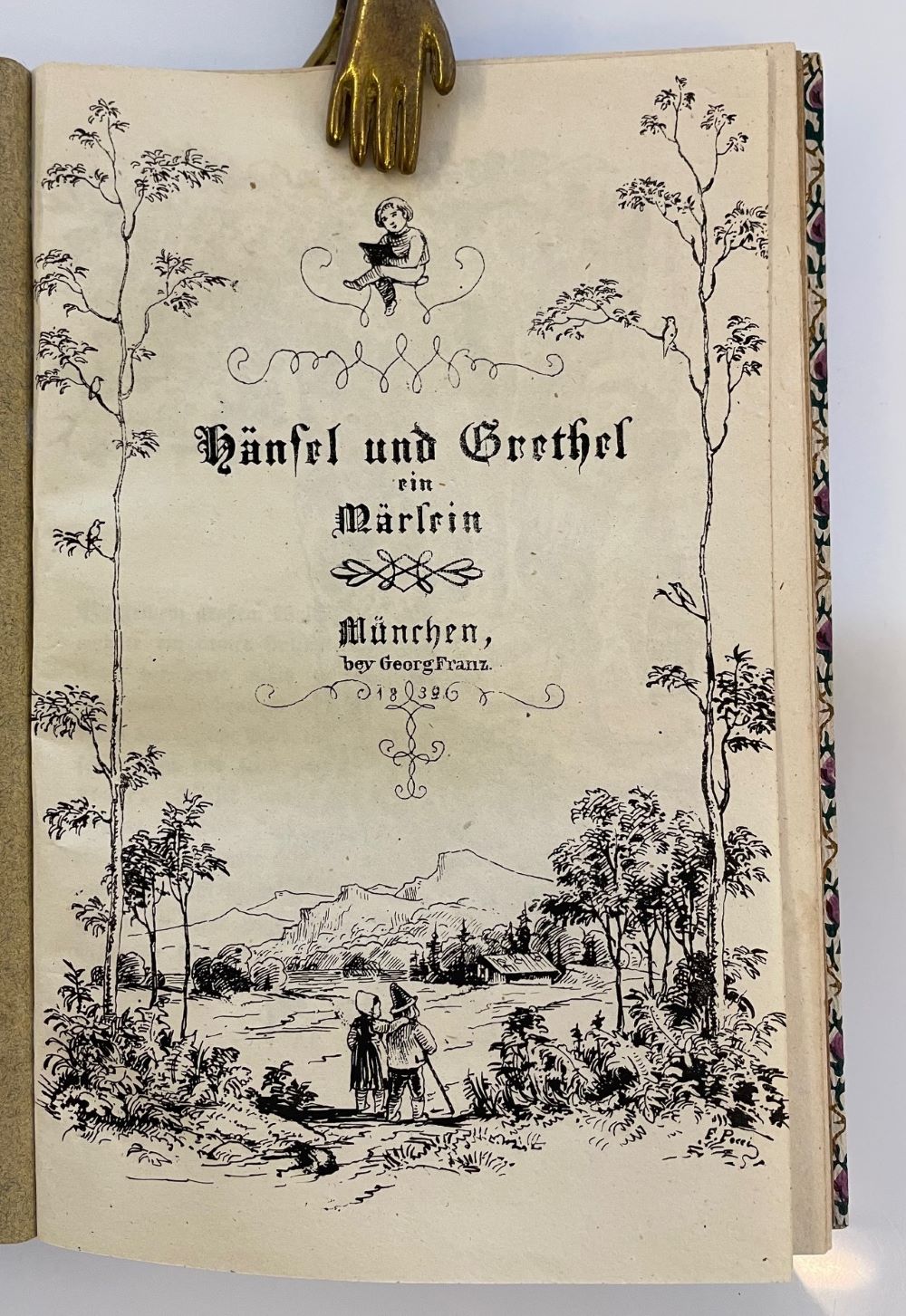 POCCI, F.v.: Hänsel und Grethel ein Märlein. München, G. Franz 1839. 20 S., 21 Vignetten. Illustrierter Originalumschlag. [Angebunden]: -: Das lustige Märlein vom kleinen Frieder mit seinem Vogelrohr und seiner Geige. München, G. Franz [1838] 24 S., 23 Vignetten Illustrierter Originalumschlag. [Angebunden]: -: Blaubart. Ein Märchen erzählt u. gezeichnet. München, Ch. Kaiser [1846] 1 Bl., 16 S.. Illustrierter Originalumschlag. [Angebunden]: -: Märlein von Einem der auszog das Fürchten zu lernen. (München, G. Franz)[1838] 24 S., 31 Illustrationen Originalumschlag [Vorangebunden]: [VÖLLINGER, K.L.]: Der Fundevogel ein Märlein von Grimm. München, Ch. Kaiser [1845] 14 S. (einschliesslich OU). 14 Illustrationen. Illustrierter Originalumschlag. 5 Werke in einem Band. Vereinzelt etwas gebräunt. Späterer Halbleinenband. Originalumschläge eingebunden.