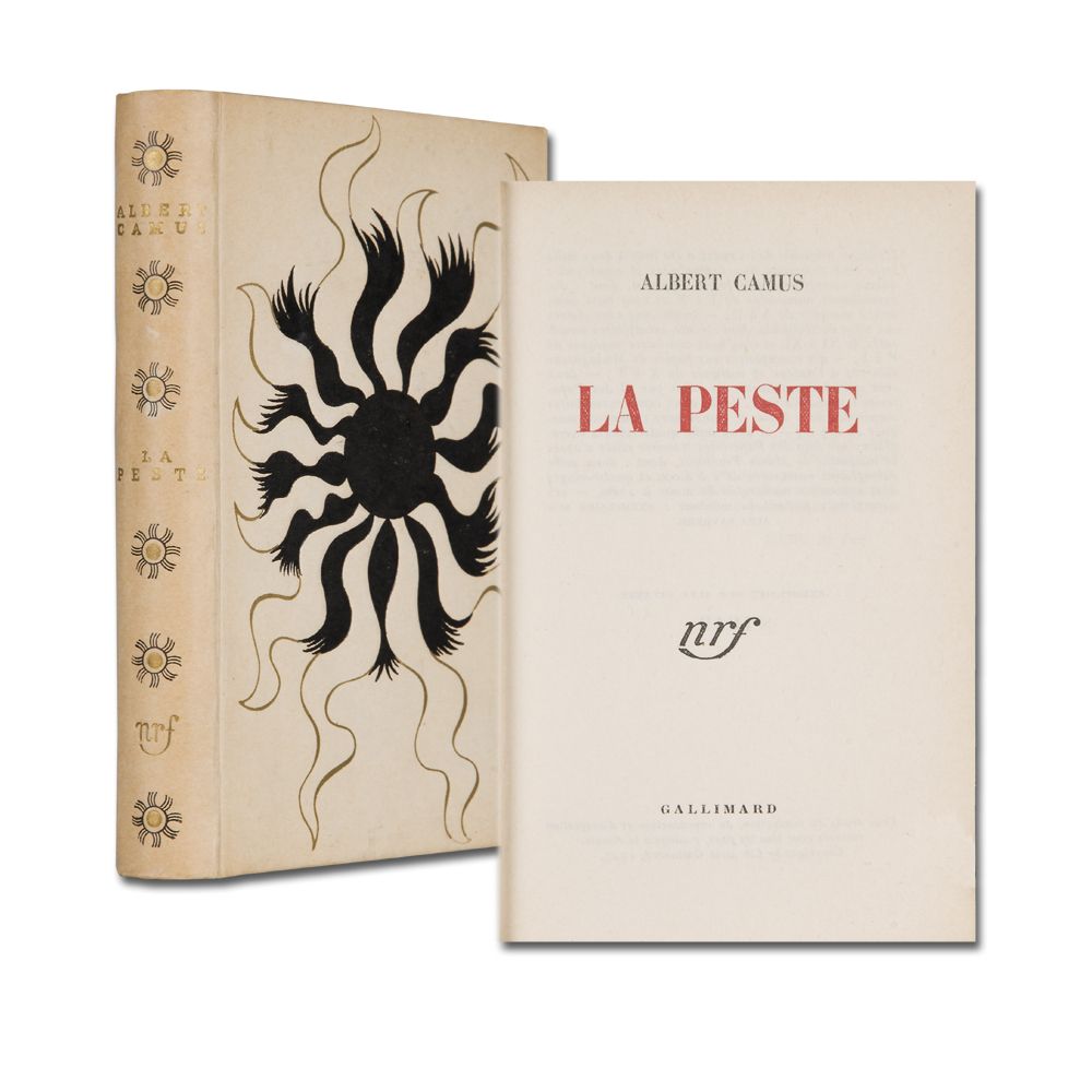 Erste Ausgabe. - Nummeriertes Exemplar. Sauberer Druck auf chamoisfarbenem Papier, Titel in Rot und Schwarz; gedruckt bei E. Grevin & Fils in Lagny-sur-Marne. Einer der großen literarischen Texte des 20. Jahrhunderts und zugleich das erfolgreichste Prosawerk von Albert Camus (1913-1960). Der berühmte Roman entstand während des 2. Weltkrieges zwischen 1939 und 1943 und wurde im Juni 1947 in der hier vorliegenden Form zum ersten Mal publiziert. Es war "die entschiedene Behauptung der wertsetzenden moralischen Kraft des einzelnen, die weltweite Resonanz fand und die überzeugte, nicht zuletzt weil Camus selbst sie gelebt hatte." (KNLL 3, 572).