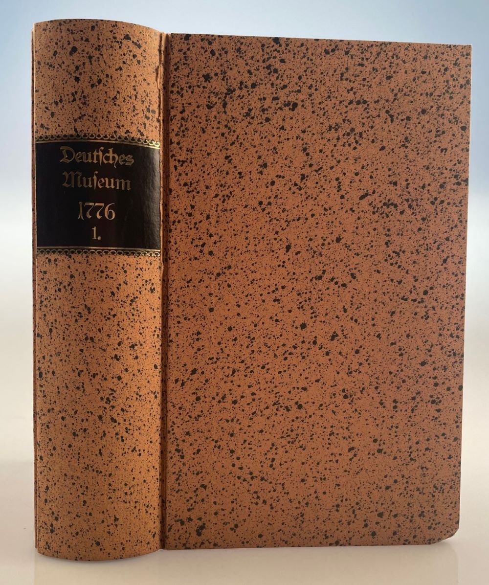 DEUTSCHES MUSEUM: [Hrsg. von Heinr. Boie [bis 1778] und Chr. v. Dohm]. Jg. 1-2, 5-9, 11-12 [= 9 von 13 Jg.] 18 Bände. Leipzig Weigand 1776-87 10 z. T. gefaltete Kupfer, davon 2 Landkarten, 13 Notenkupfer, 11 Bl. und 1 Notenkupfer auf altem Papier faksimiliert. Papierbedingt gebräunt. Pappbände im Stil der Zeit. Originalumschläge eingebunden.