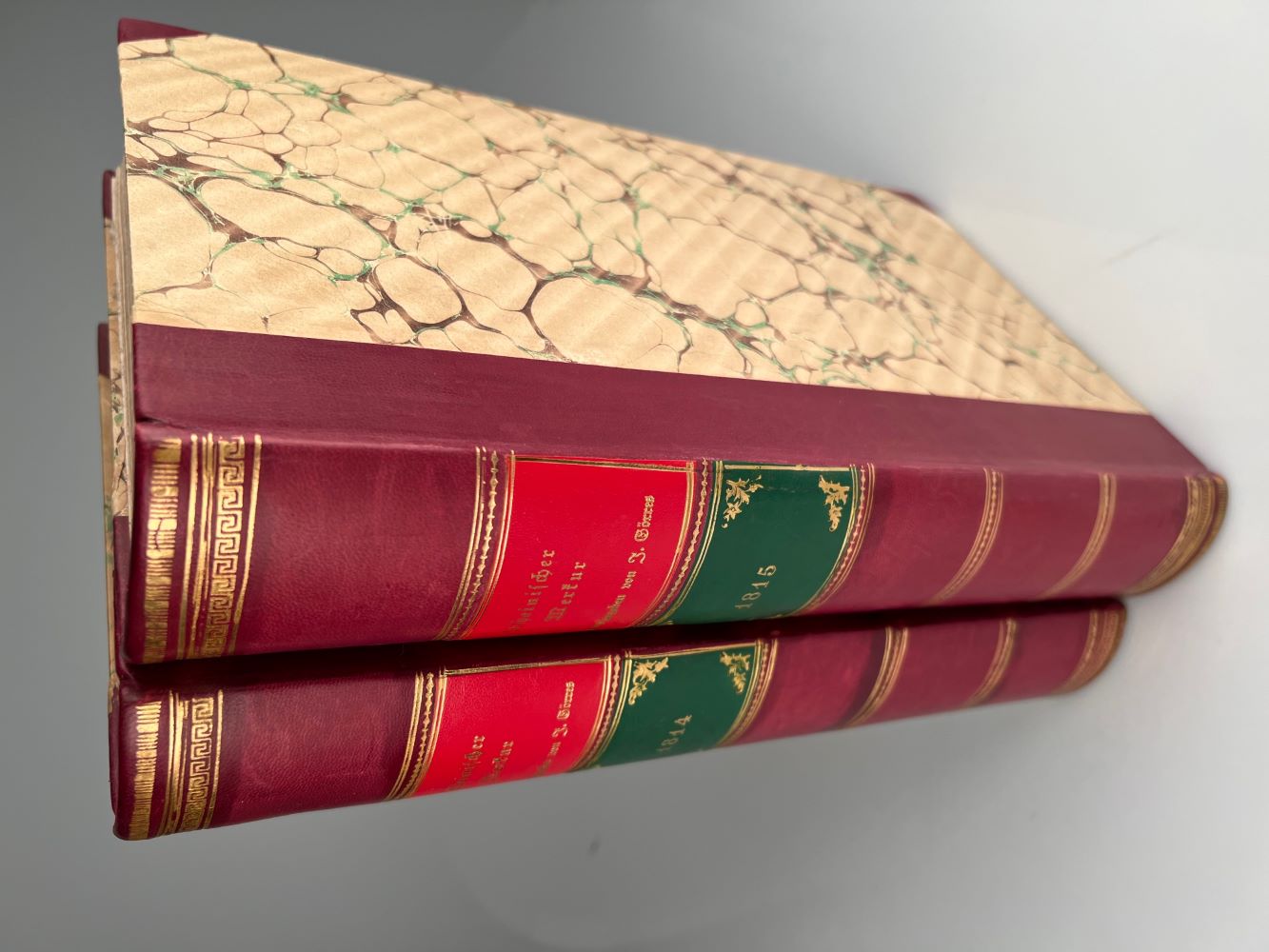 RHEINISCHER MERKUR [Herausgegeben von J. Görres]. Erster (- dritter) Jahrgang in 2 Bänden. Nr. 1-357 (à 2 Bl.), 93 Beilagen und 7 Extrablätter (davon 1 faksimiliert), 1 Haupttitel [alles Erschienene]. Koblenz Pauli und (ab Nr. 277) Heriot 1814-16. Folio. Ohne das gestochene Porträt von L.E. Grimm.Teils minimale Faltspuren, insgesamt sehr gut erhaltenes Exemplar. 21/12 Halblederbände im Stil der Zeit mit Rückenvergoldung.
