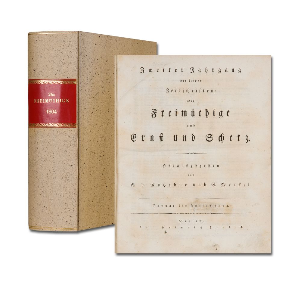 KOTZEBUE, A.v. und MERKEL, G. (Hrsg): Der Freimüthige und Ernst und Scherz. 2. Jahrgang der beiden Zeitschriften. Herausgegeben von A. v. Kotzebue und G. Merkel. [Mit einer Rezension über das Lustspiel "Der Preis" von E.T.A. Hoffmann]. Berlin H. Frölich 1804. Quart. 5 Bl., 520, 524 S. Ohne den 2. Halbjahrestitel, die Kupfer und S. 511-12. Zahlreiche Noten in Holzschnitt-Typendruck im Text. Literarischer und artistischer Anzeigender 216 S. (54 Nrn.)Vereinzelt etwas braunfleckig. 22/11 Pappband.