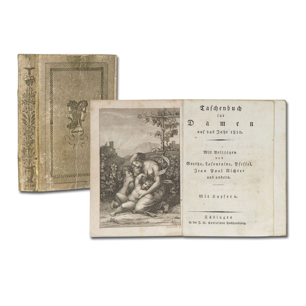 TASCHENBUCH für Damen auf das Jahr 1810. Mit Beiträgen von Goethe, Lafontaine, Pfeffel, Jean Paul Richter und andern Tübingen J. G. Cotta [1809] Duodez. 9 Bl., XXXII, 288 S., 10 Kupfertafeln. Teils etwas stockfleckig. Goldschnitt. Illustrierter Originalpappband.