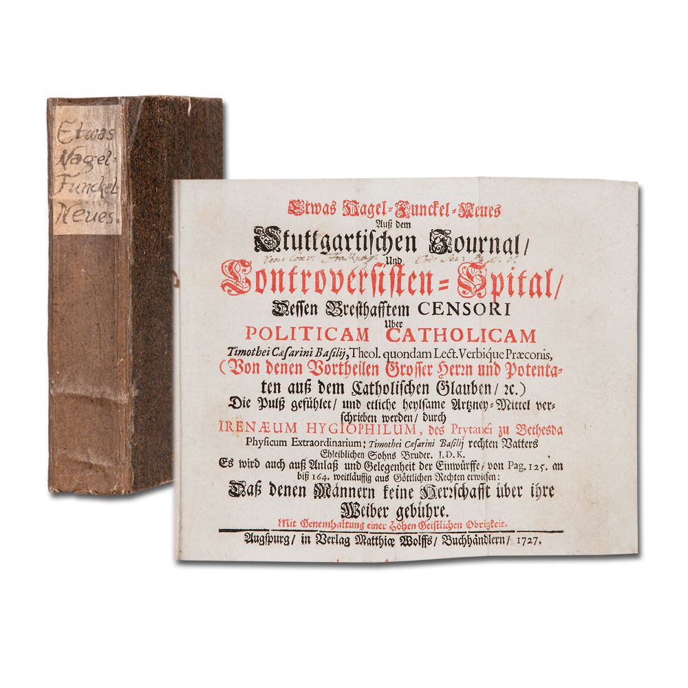 HYGIOPHILUS, Irenaeus: Etwas Hagel-Funckel-Neues Auß dem Stuttgartischen Journal / Und Controversisten-Spital / Dessen Bresthafftem Censori Uber Politicam Catholicam Timothei Caesarini Basilij ... Die Pulß gefühlet / und etliche heylsame Artzney-Mittel verschrieben werden . . . Es wird auch . . . erwiesen: Dass denen Männern keine Herrschafft über ihre Weiber gebühre. Augsburg M. Wolff 1727 Doppelblattgroßer Titel, 6 Bl., 400 S. Alte Notizen auf den fliegenden Vorsätzen. Schönes Exemplar. Pappband der Zeit.