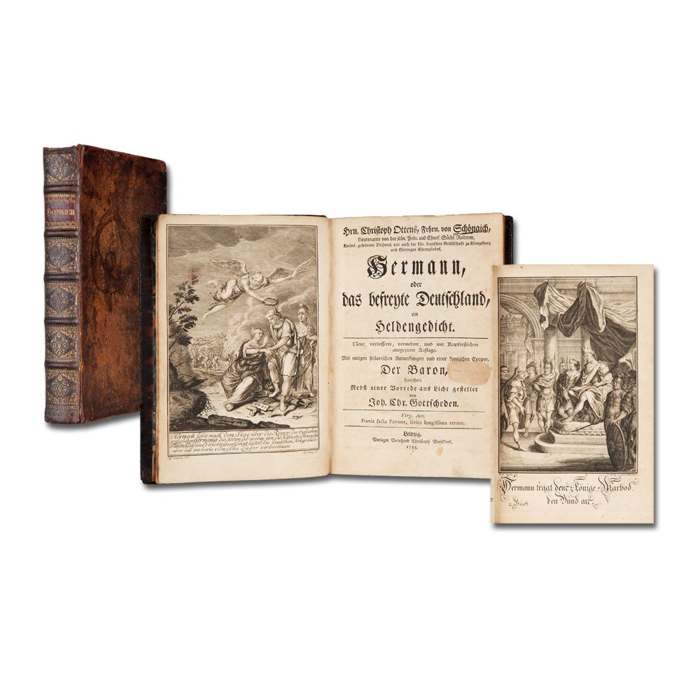 SCHÖNAICH, Christoph Otto Frhr. von: Hermann, oder das befreyte Deutschland, ein Heldengedicht. Neue, verbesserte, vermehrte, und mit Kupferstichen ausgezierte Auflage. Mit einigen historischen Anmerkungen und einer komischen Epopee, Der Baron, bereichert. Nebst einer Vorrede ans Licht gestellet von Joh. Chr. Gottscheden ... Leipzig B. Chr. Breitkopf 1753 Gestochenes Frontispiz, 7 Bl., XXVI, 272 S., mit 1 Kupfervignette im Text und mit 12 Kupfertafeln. Lederband der Zeit mit reicher ornamentaler Rückenvergoldung und farbigem Rückenschild.