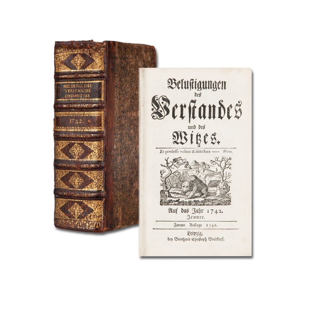 BELUSTIGUNGEN des VERSTANDES und des WITZES: Auf das Jahr 1742. Jenner (-Christmonat). (Herausgegeben von J. J. Schwabe). Zweyte Auflage. Leipzig B. Chr. Breitkopf [1744] 579 S., 2 Bl.; 4 Bl., 581 S., 1 Bl., wiederholte Holzschnitt-Titelvignetten. Halblederband der Zeit, Kapital mit kleinen Läsuren, beschabt und berieben, mit reicher ornamentaler Rückenvergoldung.