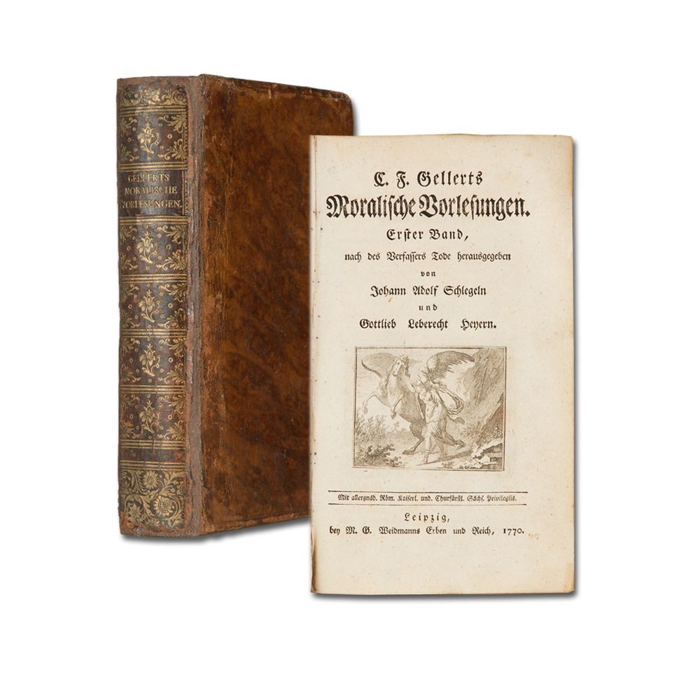GELLERT, C. F.: Moralische Vorlesungen. [...] nach des Verfassers Tode herausgegeben von Johann Adolf Schlegeln und Gottlieb Leberecht Heyern. 2 Bände in 1 Leipzig M. G. Weidmann u. Reich 1770 XXXVIII, 256 S., 1 Bl., S. 257-358; 2 Bl., S. 359-650, mit gestochener Titelvignette. Marmorierter Kalblederband der Zeit mit Rückenschild und reicher fleuraler Rückenvergoldung. Zwei Ecken bestoßen, Rücken unterlegt.