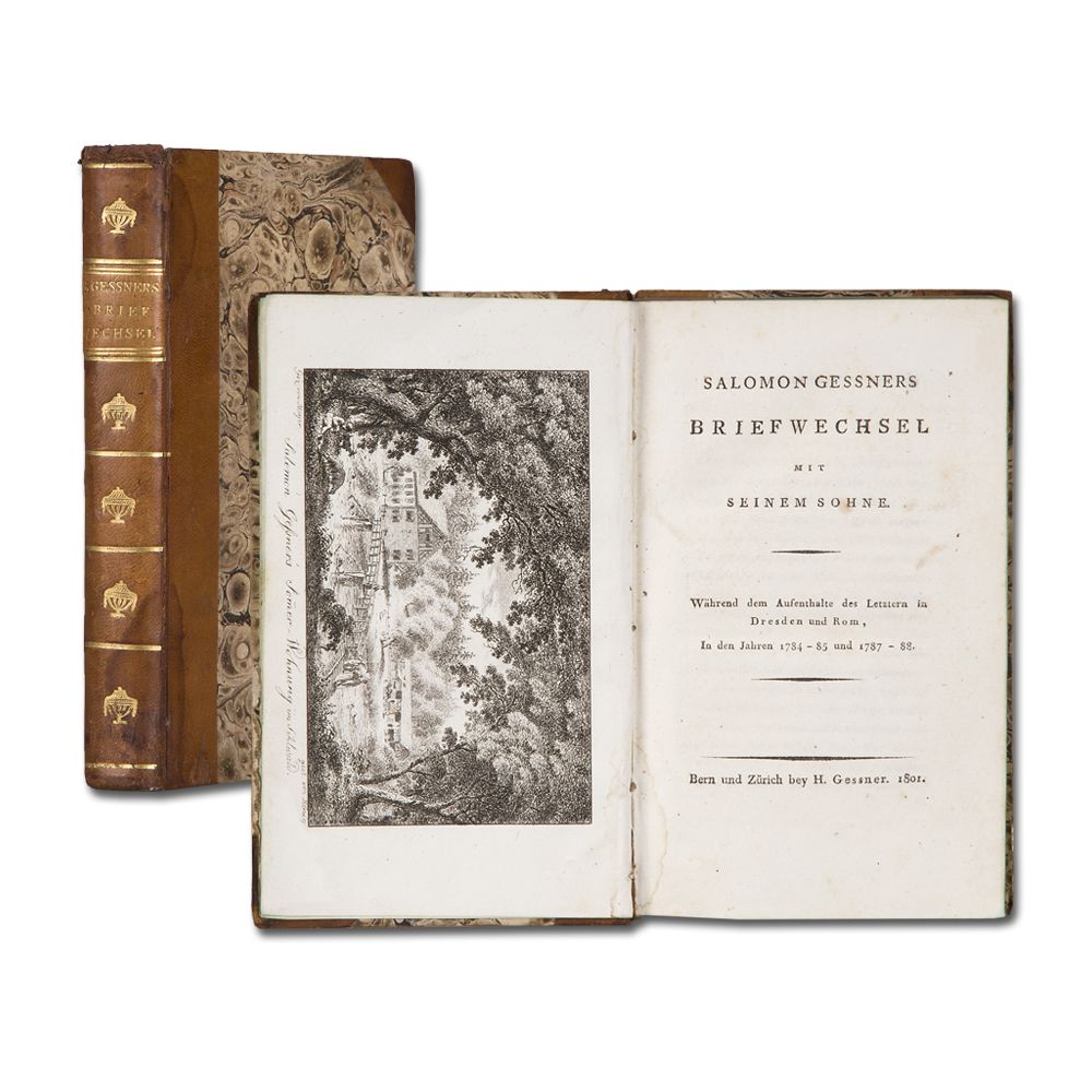 Erstausgabe des Briefwechsels zwischen Salomon Gessner (1730-1788) und seinem ältesten Sohn Konrad (1764-1826), dem Maler, der vorwiegend künstlerische Themen beinhaltet. Konrad hatte das künstlerische Talent seines Vaters geerbt und befand sich zwischen 1784-89 im Ausland (Dresden, Rom, Neapel), um seine Ausbildung zu erweitern (u.a. Begegnungen mit Anton Graff, Johann Heinrich Wilhelm Tischbein und Alexander Trippel). Salomons jüngster Sohn Heinrich (1768-1813), Buchdrucker und bedeutender Verleger von Literatur (u.a. Wieland, Pestalozzi und Kleist) gab den Briefwechsel heraus. Gleichzeitig erschienen zwei Drucke, in Fraktur und wie vorliegend, in Antiqua. Nur der Antiqua-Druck enthält das Frontispiz: "Salomon Geßners Sommer-Wohnung" im heute noch erhaltenen Forsthaus im Sihlwald. - Goedeke IV, 1, 81, 2.