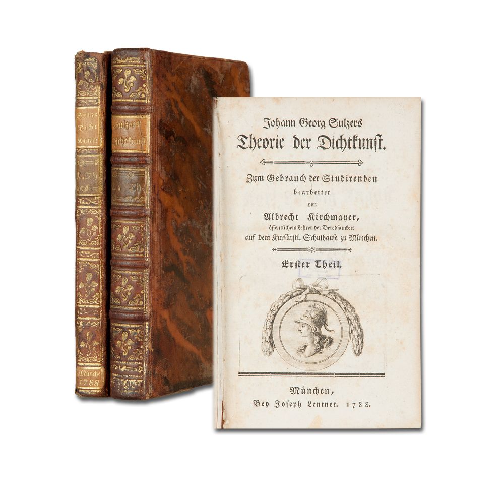 SULZER, J. G.: Theorie der Dichtkunst. Zum Gebrauch der Studirenden bearbeitet von A. Kirchmayer. 2 Theile in 2 Bänden. München J. Lentner 1788 7 Bl., 285 S.; 6 Bl., 347 S. Mit 2 gestochenen Titelvignetten und Holzschnitten im Text. Titelblätter verso gestempelt. Kalblederbände der Zeti mit Rückenvergoldung. Band 1 Supralibros auf Vorder- und Rückendeckel. Gold- bzw. Rotschnitt. Am oberen Kapital restauriert.