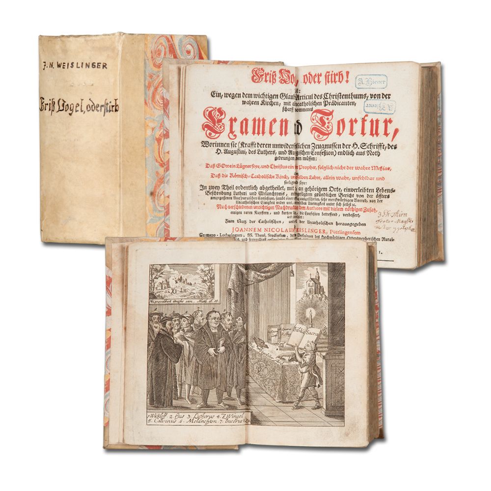WEISLINGER, J. N.: Friss Vogel, oder stirb! Das ist: Ein, wegen dem wichtigen Glaubens-Articul des Christenthums ... mit allen uncatholischen Prädicanten scharff vorgenommenes Examen und Tortur ... In zwey Theil ordentlich abgetheilet ... von dem Authore mit vielem nöthigen Zusatz ... verbessert, und selbst corrigirt. Oberammergau, M. Wagner 1751 Doppelblattgroßes gestochenes Frontispiz, doppelblattgroßer Titel in Rot und Schwarz, 17 Bl., CCCCLXX, 618 S., 15 Bl., 7 teils gefaltete Kupfertafeln. Titel mit altem Besitzvermerk und kl. Stempel. Teils etwas gebräunt, braun- und stockfleckig. Halb-Pergamentband im Stil der Zeit.