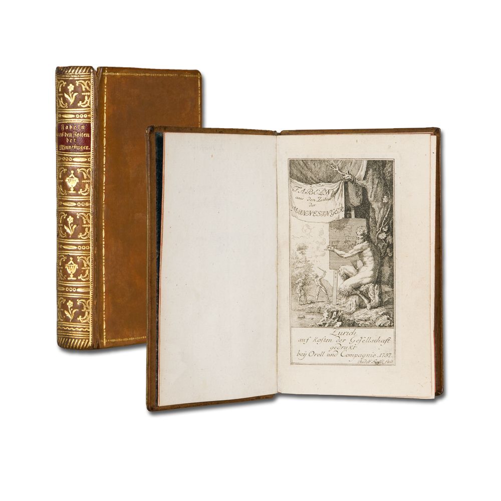 [BONER, U.]: [Edelstein]. Fabeln aus den Zeiten der Minnesinger. [Herausgegeben von J. J. Bodmer und J. J. Breitinger]. Zürich Orell und Compagnie 1757 Kleinoktav. Gestochener Titel von R. Fuessli, 7 Bl., 350 S. Alter Name im Vorsatz. Buntpapiervorsätze. Schöner Lederband der Zeit mit reicher Rückenvergoldung. Goldfileten auf den Deckeln, Stehkantenvergoldung.