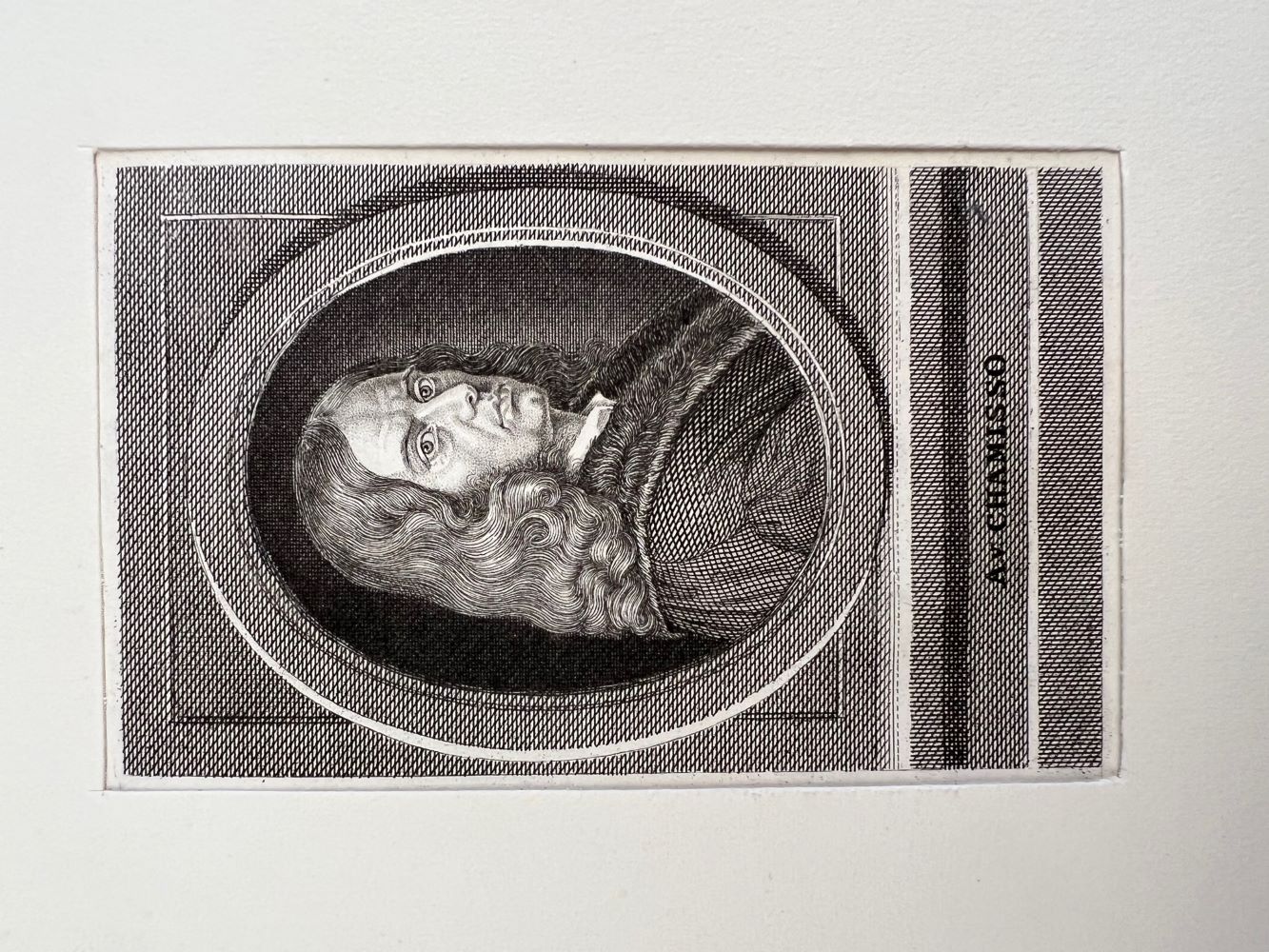 CHAMISSO, Adalbert von. - Portrait, Porträt, Brustbild nach rechts. Stahlstich (anonym) nach einem Gemälde von Robert Reinick. [um 1840] 10 x 6 cm. Passepartout.