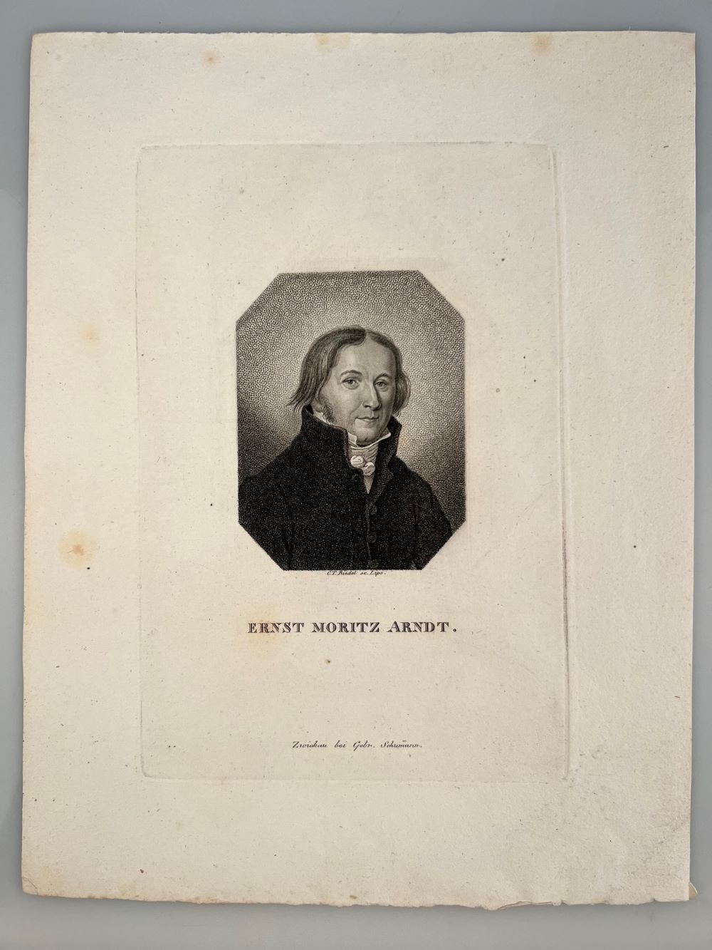 ARNDT, Ernst Moritz. - Portrait, Porträt, Brustbild nach rechts. (Oktagon). Kupferstich in Punktiermanier von Lips nach C.T. Riedel. Zwickau, Gebr. Schumann [ca. 1820] 9x7 cm Plattenrahmen 19,5 x 13 cm