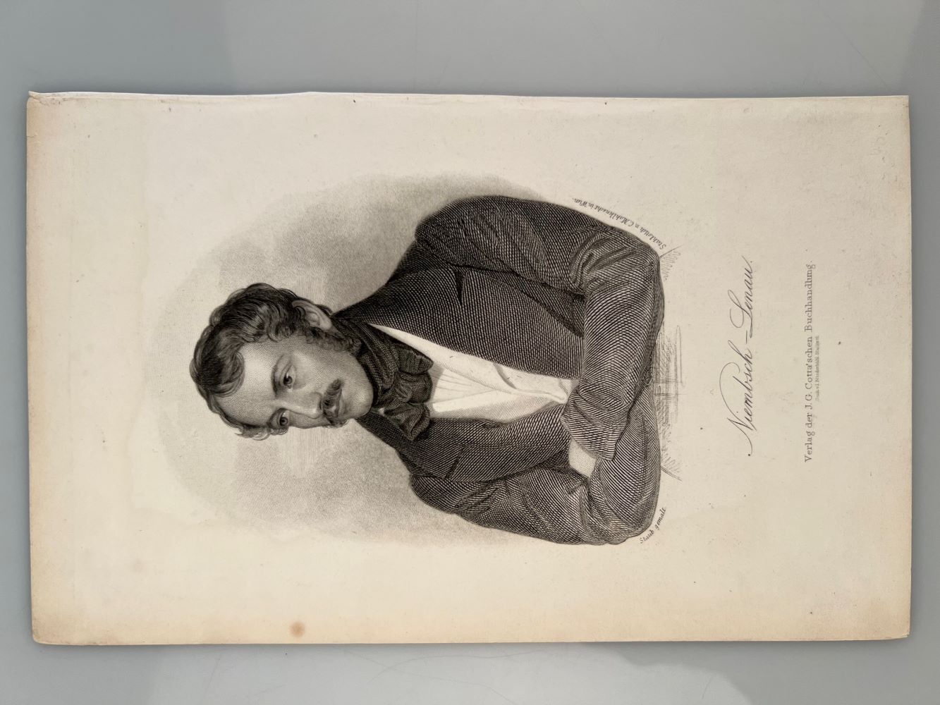 LENAU, Nicolaus. - Portrait, Porträt, Brustbild, Halbfigur nach links mit verschränkten Armen. Stahlstich von C. Mahlknecht nach einem Gemälde von Staub. Stuttgart, J.G. Cotta [ca. 1850] 21 x 12,8 cm