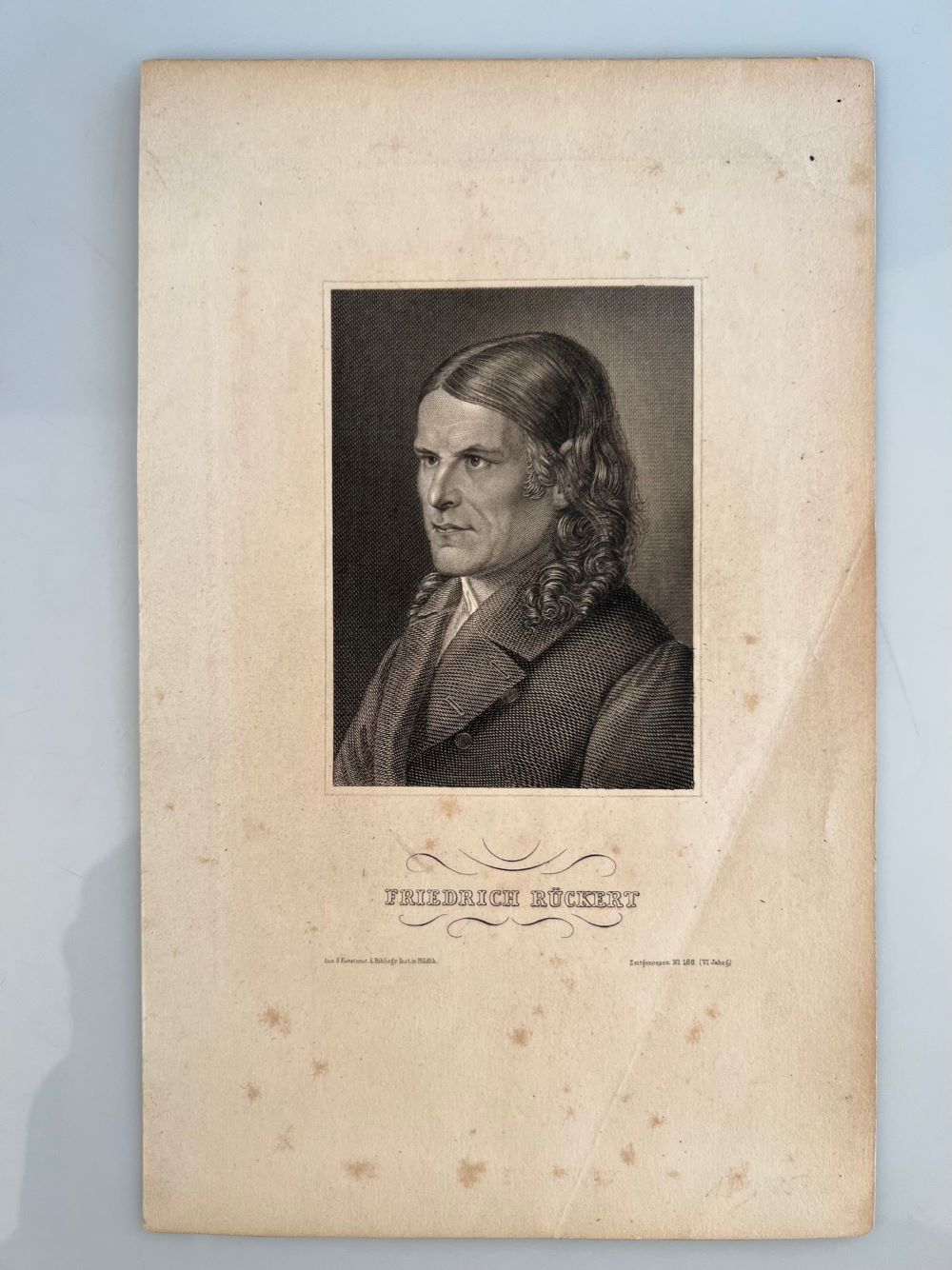 RÜCKERT, Friedrich. - Portrait, Porträt, Brustbild nach links. Stahlstich (von C. Barth?] Zeitgenossen No.166 (VI. Jahrg.) Hildb[urg]h[ausen], Bibl. Institut [um 1860] 16 x 11 cm. Papierbedingt leicht gebräunt.