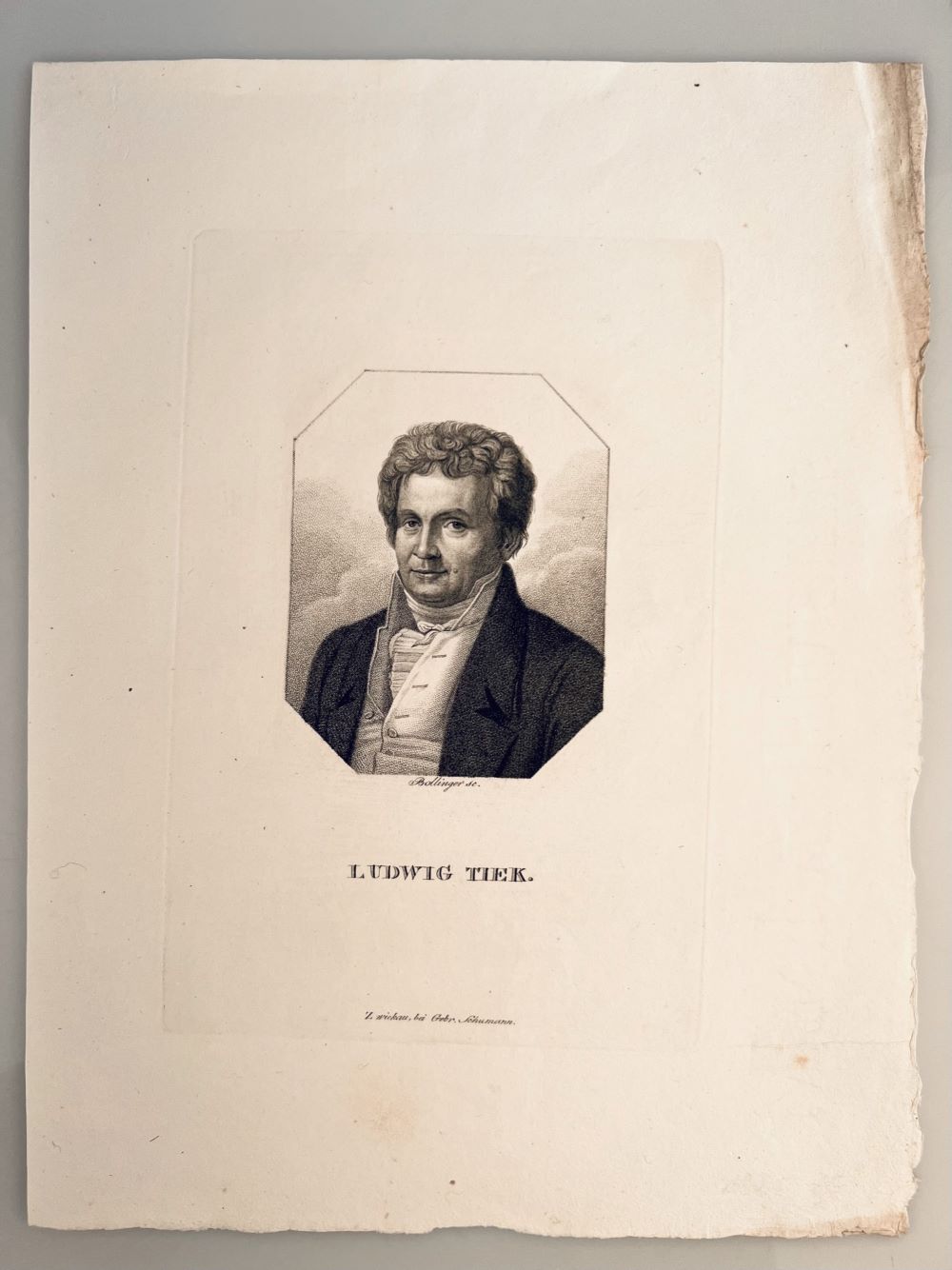 TIE[C]K, Ludwig. - Portrait, Porträt, Brustbild nach links. Kupferstich in Punktiermanier von Bollinger. Zwickau, Gebr. Schumann [1819] 18 x 12 cm. Schöner Abzug.