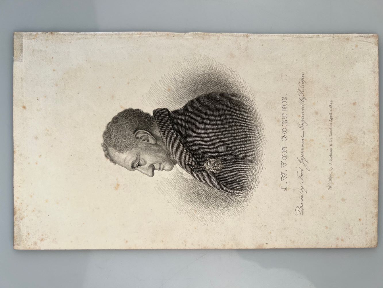 GOETHE, Johann Wolfgang von: Portrait, Porträt, Brustbild nach links. Kupferstich in Punktiermanier von R. Cooper nach F. Jagemann. London, J. Robins 1829 19 x 11,5 cm. Ganz leicht stockfleckig.