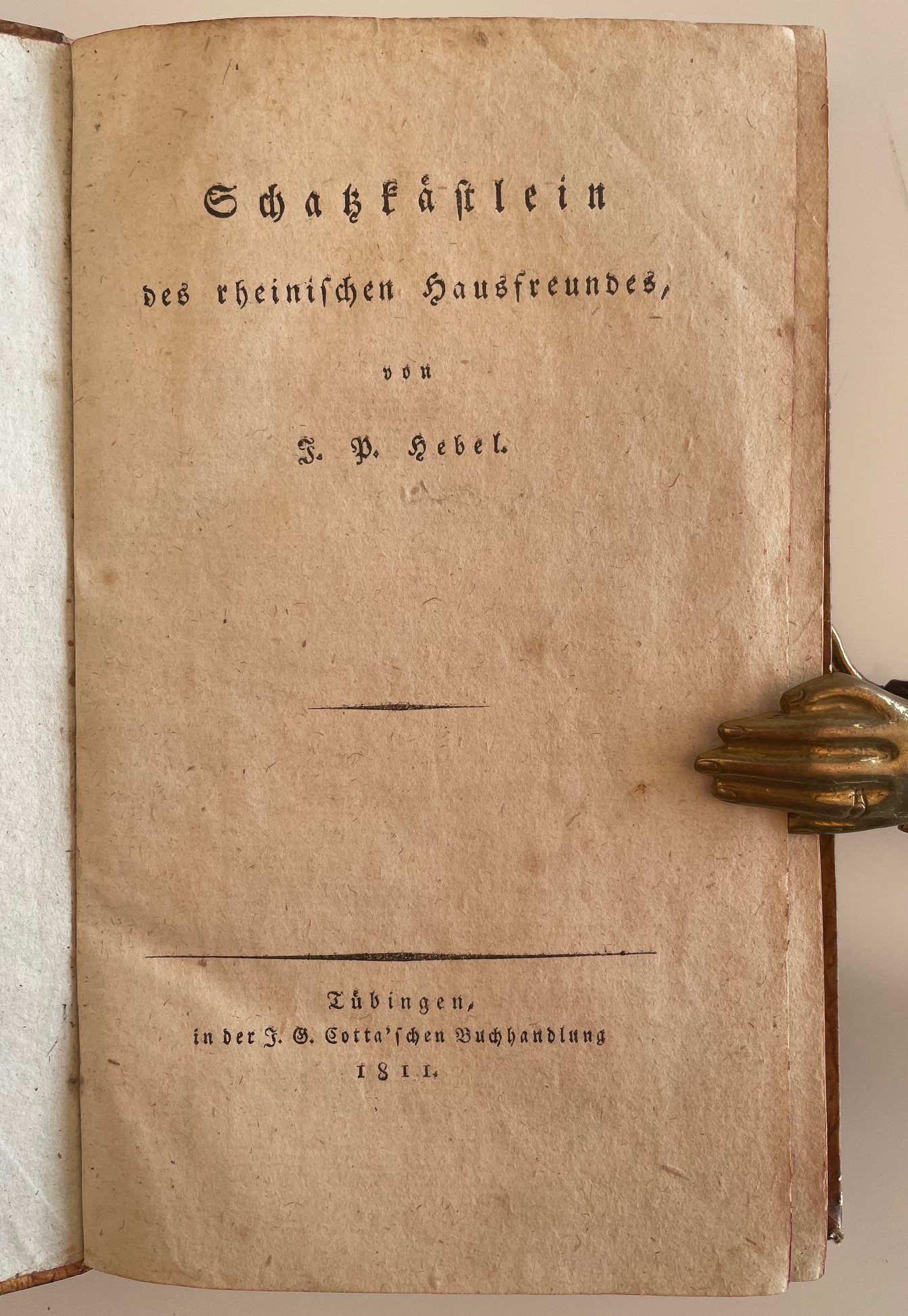 HEBEL, J. P.: Schatzkästlein des rheinischen Hausfreundes. Tübingen J.G. Cotta 1811. VIII, 296 S. Vereinzelt etwas stockfleckig. Die letzten Bl. mit kleiner Wurmspur an der oberen äußeren Ecke. Pappband der Zeit. Leichte Gebrauchsspuren.
