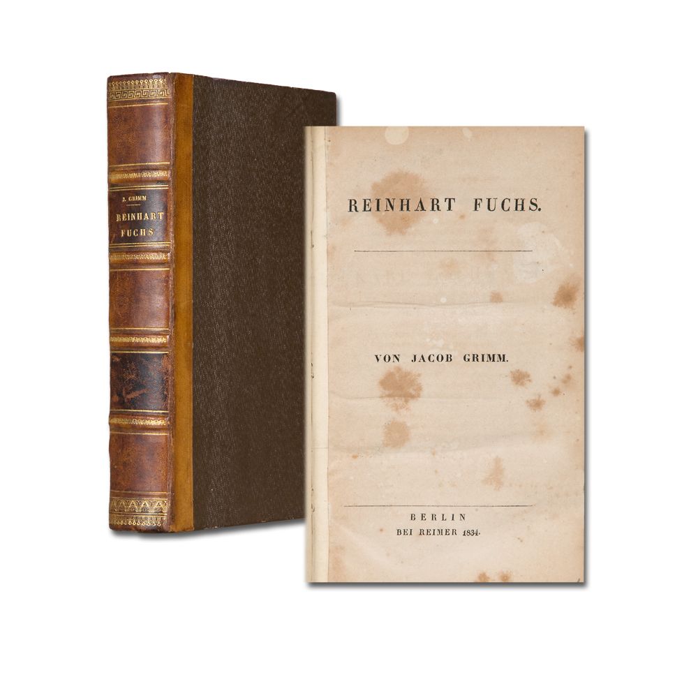 GRIMM, J.: Reinhart Fuchs. Berlin Reimer 1834 5 Bl., CCXCVI, 452 S., 2 Bl. (2 Blatt doppelt). Gebräunt und stockfleckig. Alter Name im Vorsatz. Halblederband der Zeit mit Rückenvergoldung.