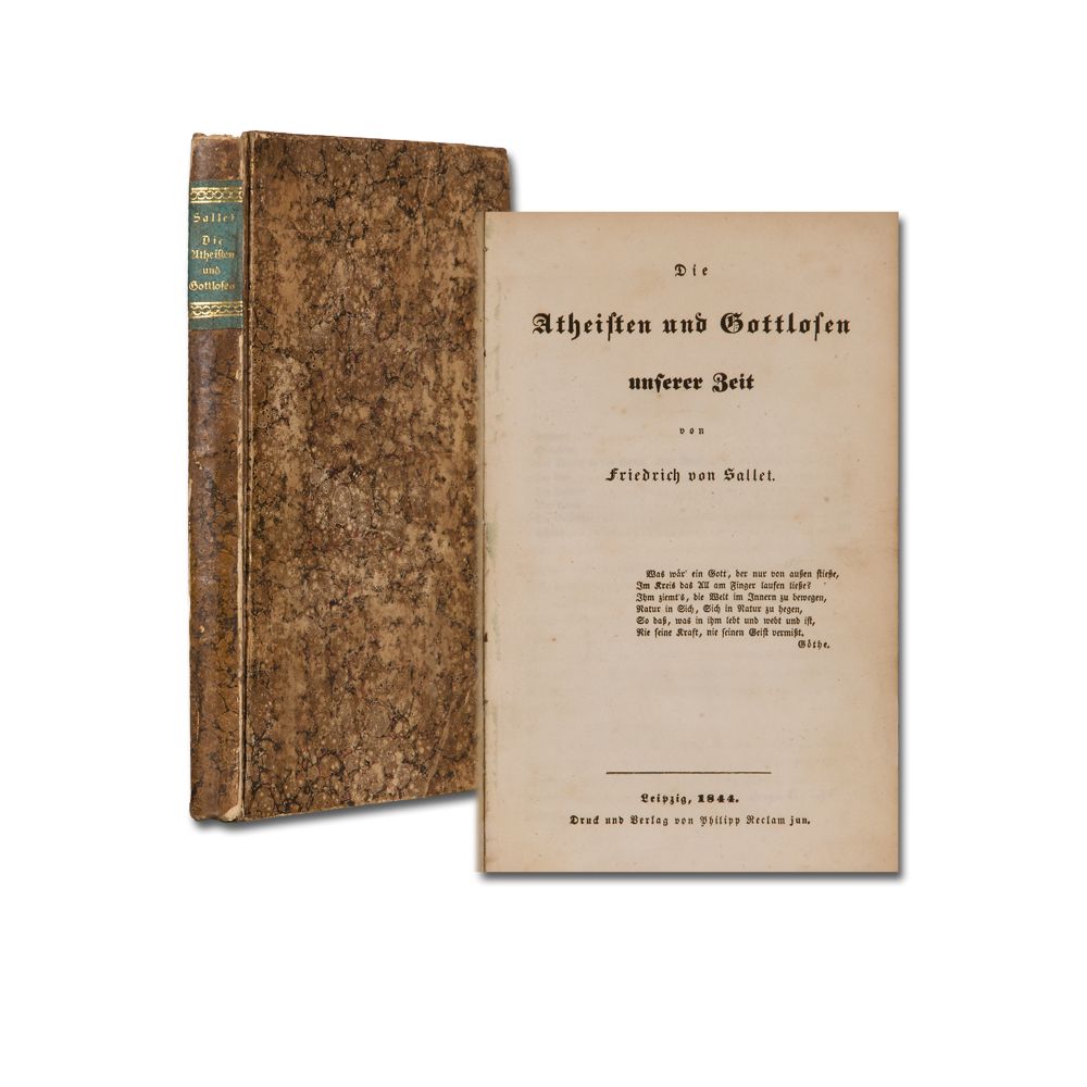 SALLET, Fr. v.: Die Atheisten und Gottlosen unserer Zeit. Leipzig, Ph. Reclam 1844. VIII, 223 S. Vorsatz gestempelt. Innen gebräunt, vereinzelt stockfleckig. Pappband der Zeit, etwas berieben.