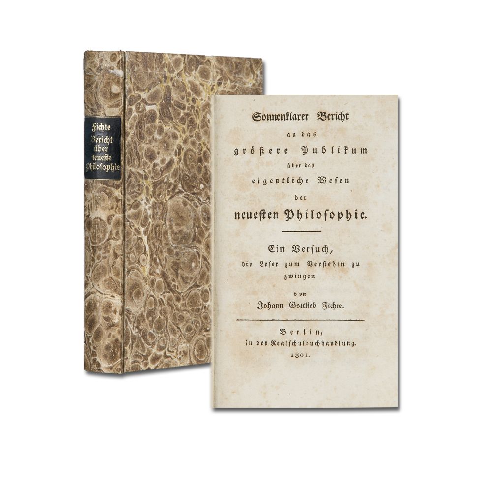 FICHTE, J. G.: Sonnenklarer Bericht an das größere Publikum über das eigentliche Wesen der neuesten Philosophie. Ein Versuch, die Leser zum Verstehen zu zwingen. Berlin Realschulbuchhandlung 1801. XX, 232 S., gebräunt. Pappband mit zeitgenössischem Buntpapier.