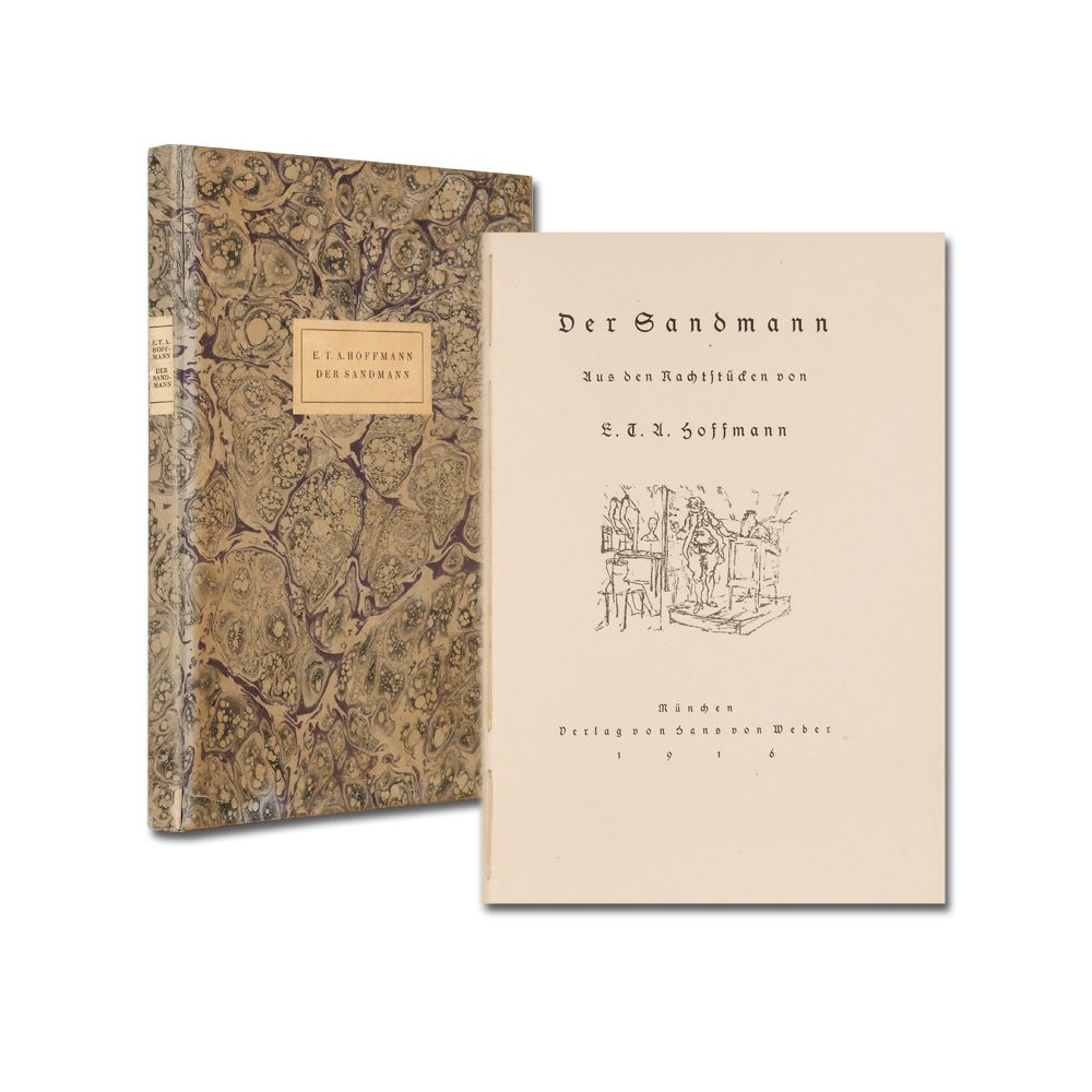 HOFFMANN, E. T. A.: Der Sandmann. Aus den Nachtstücken. München Hans von Weber 1916 Quart. 3 Bl., 66 S., 3 Bl. Mit 35 (davon 8 ganzs.) Original-Lithographien von G[ustel] Königer. Handgebundener, marmorierter Original-Pappband mit Rücken- und Deckelschildchen.