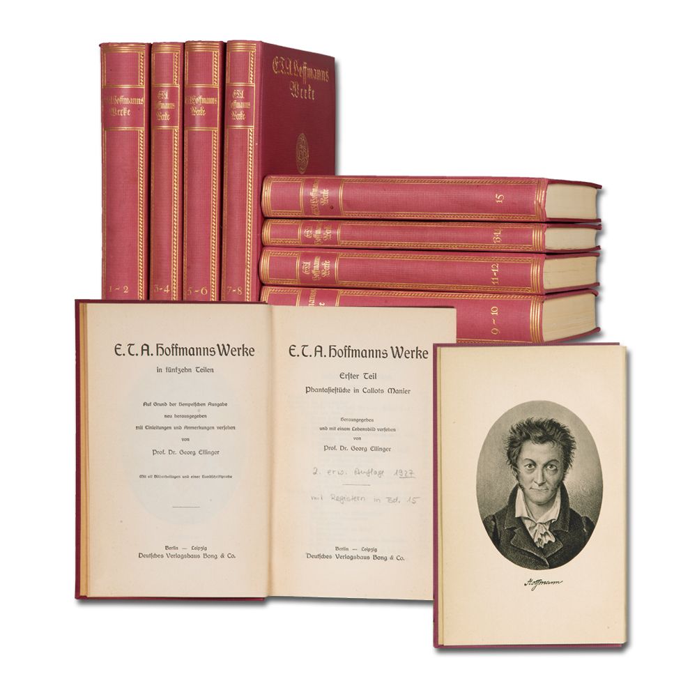 HOFFMANN, E. T. A.: Werke in fünfzehn Teilen. Auf Grund der Hempelschen Ausgabe neu herausgegeben mit Einleitungen und Anmerkungen versehen von G. Ellinger. [2. erweiterte Auflage] 15 Teile in 8 Bänden. Berlin und Leipzig Bong [1927] Mit 11 Bildeinlagen und einem Faksimile der Handschrift. Rote Originalleinenbände.