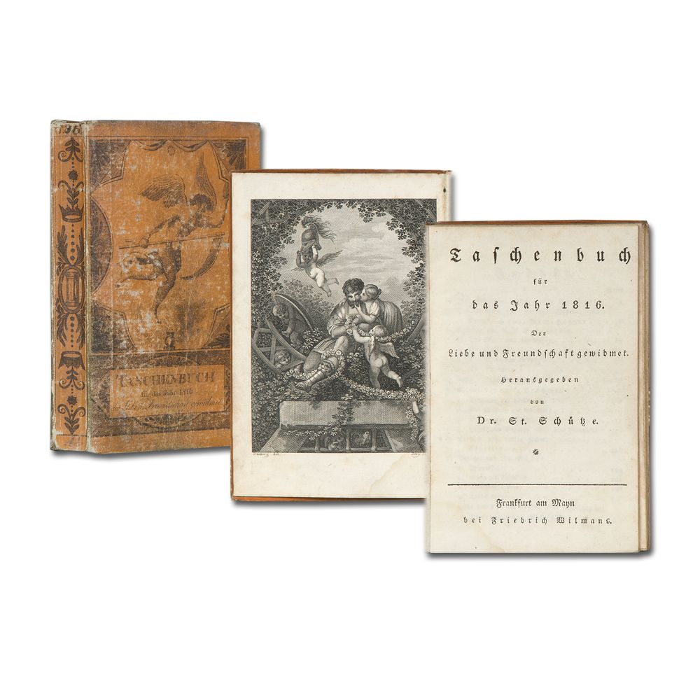 TASCHENBUCH für das Jahr 1816. Der Liebe und Freundschaft gewidmet. Hrsg. von St. Schütze. Frankfurt F. Wilmans [1815] Duodez. 15 Bl., 12 Monatskupfer, 316 S., 6 Kupfer. Ohne Zwischentitel S. 307/08. Teils etwas stockfleckig und wasserrandig. Goldschnitt. Illustrierte Original-Kartonage. Etwas berieben.