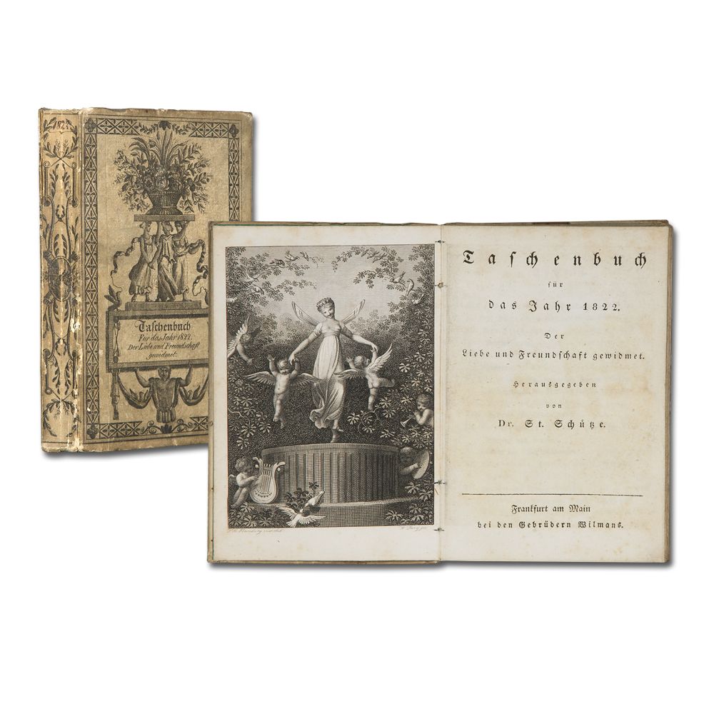 TASCHENBUCH für das Jahr 1822. Der Liebe und Freundschaft gewidmet. Hrsg. von St. Schütze. Frankfurt Gebr. Wilmans [1821] Duodez. 15 Bl., 12 Kupfertaflen, 304 S., 4 Bl. (Verlagsanzeigen), 6 Kupfertafeln. Teils etwas braunfleckig. Goldschnitt. Illustrierte Original-Kartonage. Gebräunt.