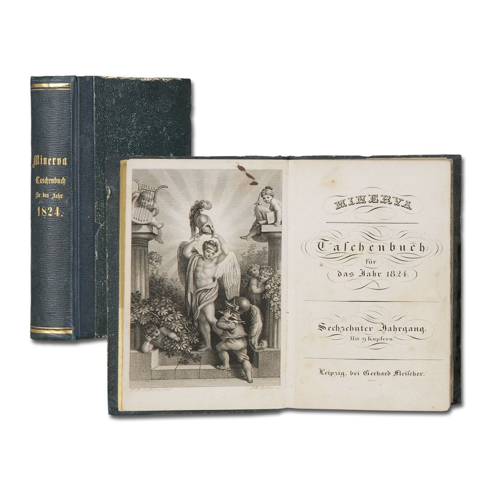 MINERVA Taschenbuch für das Jahr 1824. Jahrgang 16. Leipzig G. Fleischer [1823] Gestochenes Frontispiz, gestochener Titel, 2 Bl., XXIX (recte XXVIII) S., 448 S., 8 Kupfer, 3 gefaltete Bl. Noten in Holzschnittt-Typendruck. [ohne 4. Blatt]. Teils stockfleckig. Bindung etwas gelockert. Halbleinenband der Zeit. Kanten etwas bestoßen.