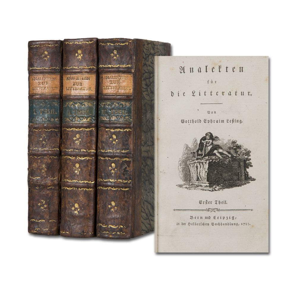 LESSING, G. E.: Analekten für die Litteratur. (Hrsg. von J. G. Heinzmann). 4 Teile in 3 Bänden. Bern und Leipzig, Hallersche Buchhandlung 1785-86. 4 gestochene Titelvignetten von [B. A.] Dunker. Teils mit Eintragungen von alter Hand sowie Stempel im Vortitel. Buntpapiervorsätze. Band 3 mit Marginalien von alter Hand. Halblederbände der Zeit, Gelenke teils angebrochen.
