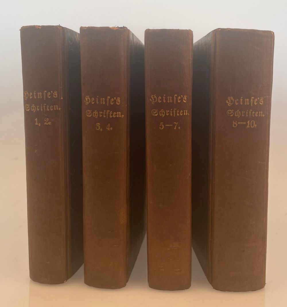 HEINSE, [J. J.] W.: Sämmtliche Schriften. Hrsg. von H. Laube. 10 Bände in 4 Leipzig F. Volckmar 1838 Teilweise etwas stockfleckig, sonst gutes Exemplar Halbleinen der Zeit.