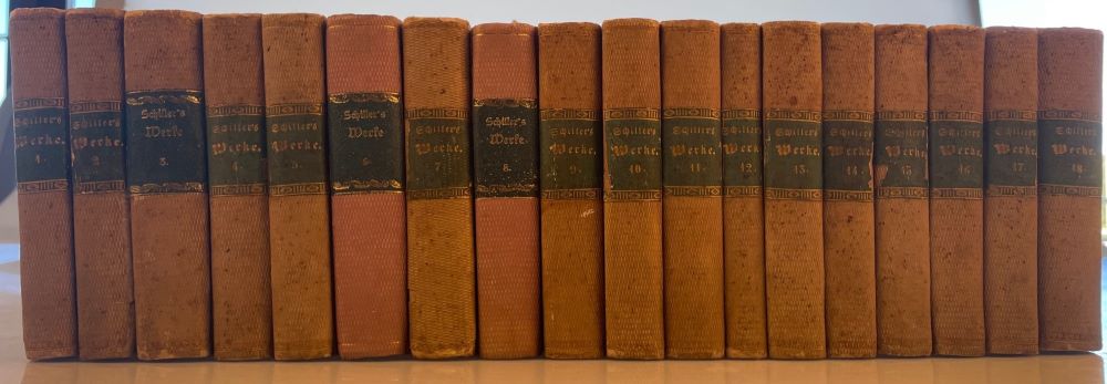 SCHILLER, F. v.: Sämmtliche Werke. [Herausgegeben von Ch. G. Körner]. 18 Bände Stuttgart und Tübingen, J. G. Cotta 1827-28 Kleinoktav. Vereinzelt leicht stockfleckig. Pappbände der Zeit mit Rückenvergoldung. Rücken ausgebleicht. 2 Bände farblich etwas abweichend.