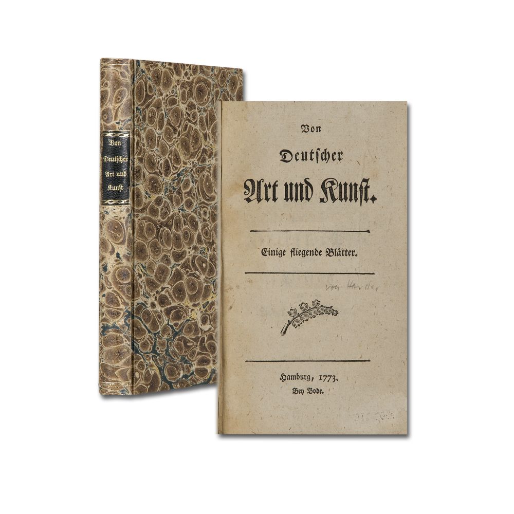 [HERDER, J. G.] [Hrsg.]: Von Deutscher Art und Kunst. Einige fliegende Blätter. Hamburg, Bode 1773. Titel mit Holzschnittvignette.(ausradierter Vermerk von alter Hand) 182 S. Wenige Blatt im Falz etwas wasserfleckig. Pappband mit zeitgenössischem Buntpapier.