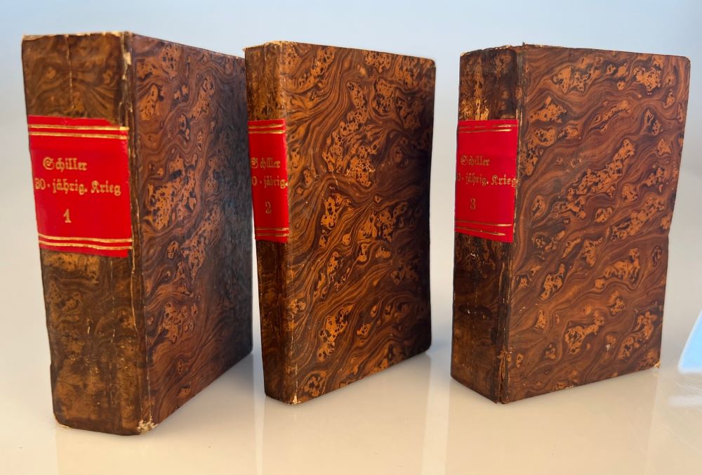 SCHILLER, F.: Geschichte des dreyssigjährigen Kriegs. Erster (- Dritter) Theil aus dem Calender für Damen 1791 (bis 1793) gedruckt. 3 Bände. Leipzig G. F. Göschen. 1793. Duodez. 1 Bl., VI, 509 S. ; 33 Bl., 32 S., S. 389-472, 22 Bl., LXIV S., 1 Bl., 7 Bl. (Anzeigen); 1 Bl., S. 473-860, 5 Bl. (Anzeigen). [Ohne Kupfertafeln]. Teils mit leichten Feuchtigkeitsspuren, etwas stockfleckig. Exlibris. Pappbände der Zeit. Neue Rückenschildchen.