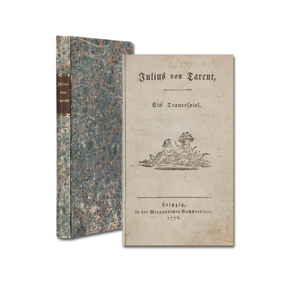 [LEISEWITZ, J. A.]: Julius von Tarent, Ein Trauerspiel. Leipzig, Weygand 1776. 109 S., 1 weisses Bl., Holzschnitt-Titelvignette. Stockfleckig und gebräunt. 2 Bl. mit kleinem Loch (kleiner Buchstabenverlust), 1 Bl. gerissen.. Pappband mit zeitgenössischem Buntpapier.
