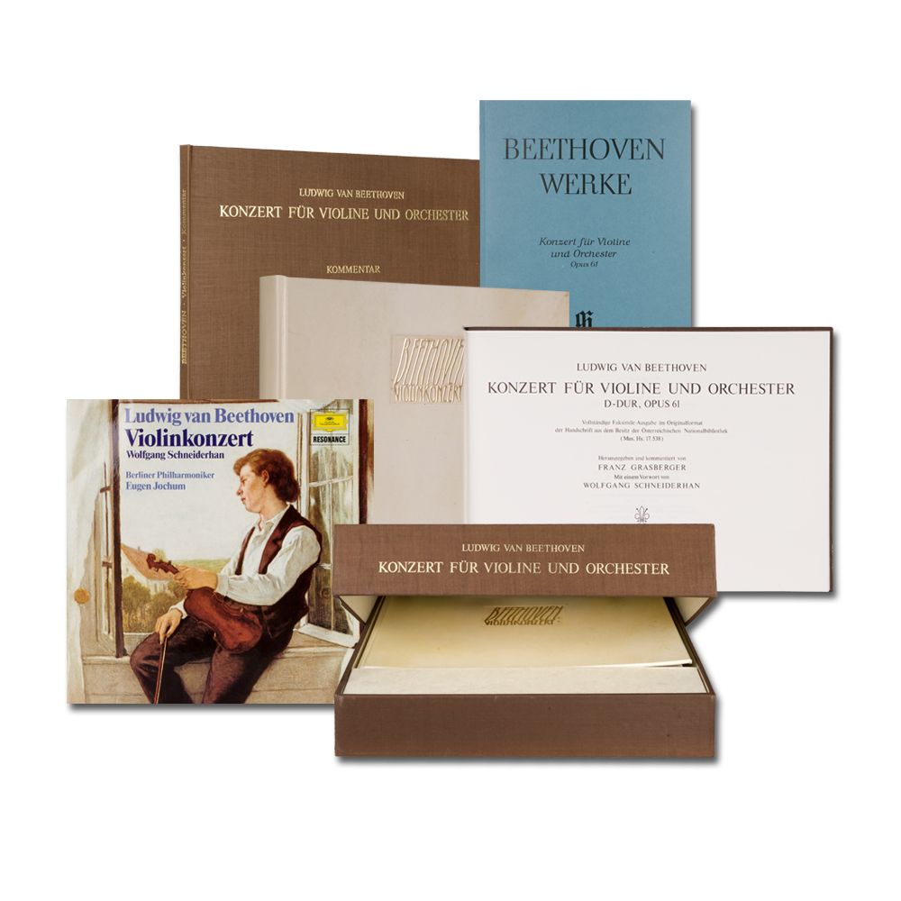 Num. Exemplar der limitierten Luxusausgabe von 250 Exemplaren auf Hahnemühle Echt-Bütten. - Die vorliegende Luxusausgabe enthält zusätzlich zur Faksimile-Ausgabe die Partitur aus der neuen Beethoven Gesamtausgabe (Beethoven Werke, hrsg. v. Beethoven-Archiv Bonn unter Leitung von Joseph Schmidt-Görg, Sonderdruck aus Abt. III, Band 4, hrsg. v. Shin Augustinus Kojima. München, G. Henle, 1978, Quart. 87 S. OKt.), den Kommentarband (Quer-Quart. 49 S. mit 29 Abb., OLn.) zur Faksimile-Ausgabe hrsg. u. kommentiert v. Franz Grasberger mit einem Vorwort v. Wolfgang Schneiderhan mit Beiträgen zur Entstehung, Uraufführung, Widmung, Originalhandschrift, Originalausgabe, Klavierkonzertfassung und der Kadenzen, außerdem eine Schallplattenaufnahme des Violinkonzerts (W. Schneiderhan, Violine, Berliner Philharmoniker, Dirigent Eugen Jochum). Die Kadenzen waren ursprünglich von Beethoven für die Klavierfassung seines D-Dur Konzertes komponiert. Die Aufnahme bringt die von Schneiderhahn für die Violine bearbeiteten Kadenzen Beethovens. - "Das Autograph von Beethovens Violinkonzert ist hauptsächlich mit einer Tinte geschrieben, die zu verblassen beginnt; zugleich ist es eines der interessantesten Beethoven-Autographe, da es nicht nur die üblichen Korrekturen bei und nach der Niederschrift zeigt, sondern auch die ersten Stufen der Revisionen der Violinstimme und Skizzen zu einer Umarbeitung zu einer Klavierstimme. Beides zusammen ist gewiß ein ausreichendes Argument dafür, die Faksimilereihe gerade mit diesem Autograph zu beginnen. Die blassen Farben der hauptsächlich benutzten Tinte, mattbraun auf gelblichem Papier, und die späteren Eintragungen mit kräftigeren Tinten, mit Rötel und mit Bleistift bilden zudem so etwas wie eine Herausforderung an die Technik des Faksimiledruckes. Der ...Verlag ... zeigt sich dieser Herausforderung gewachsen: Das Faksimile reproduziert die Oberfläche des Autographs bis in die zartesten Schattierungen hinein mit solcher ,Naturtreue‘, daß man noch die Bleistiftskizzen für wirklich mit Bleistift geschrieben halten könnte. Der Kommentar ist von lobens- und nachahmenswerter Ausführlichkeit ..."(Ludwig Finscher, in: Musica, Mai/Juni 1980, S. 304).